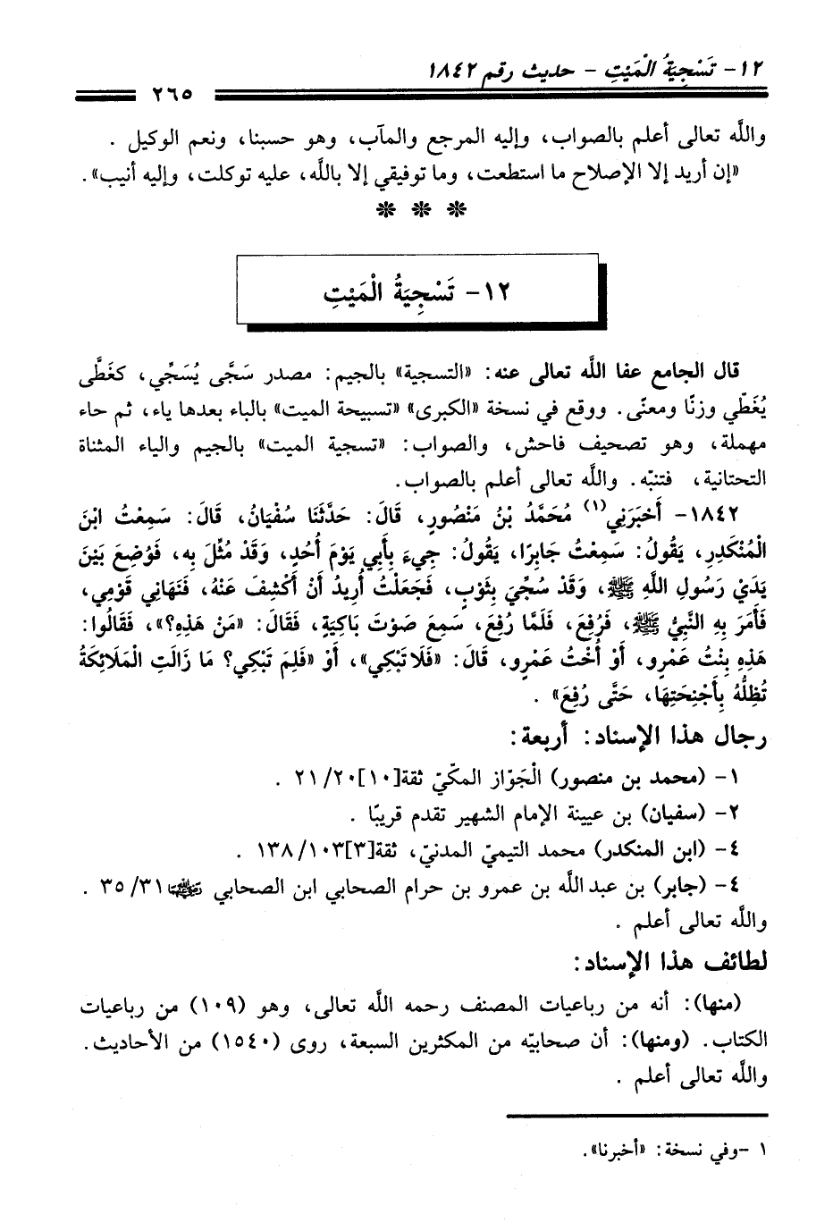 1842 - أَخْبَرَنِي (¬1) مُحَمَّدُ بْنُ مَنْصُورٍ, قَالَ: حَدَّثَنَا سُفْيَانُ, قَالَ: سَمِعْتُ ابْنَ الْمُنْكَدِرِ, يَقُولُ: سَمِعْتُ جَابِرًا, يَقُولُ جِيءَ بِأَبِي يَوْمَ أُحُدٍ, وَقَدْ مُثِّلَ بِهِ, فَوُضِعَ بَيْنَ يَدَىْ رَسُولِ اللَّهِ - صلى اللَّه عليه وسلم -, وَقَدْ سُجِّيَ بِثَوْبٍ, فَجَعَلْتُ أُرِيدُ أَنْ أَكْشِفَ عَنْهُ, فَنَهَانِي قَوْمِي, فَأَمَرَ بِهِ النَّبِيُّ - صلى اللَّه عليه وسلم -, فَرُفِعَ, فَلَمَّا رُفِعَ, سَمِعَ صَوْتَ بَاكِيَةٍ, فَقَالَ: «مَنْ هَذِهِ؟» , فَقَالُوا: هَذِهِ بِنْتُ عَمْرٍو, أَوْ أُخْتُ عَمْرٍو, قَالَ: "فَلاَ تَبْكِي", أَوْ "فَلِمَ تَبْكِي" مَا زَالَتِ الْمَلاَئِكَةُ تُظِلُّهُ بِأَجْنِحَتِهَا, حَتَّى رُفِعَ».