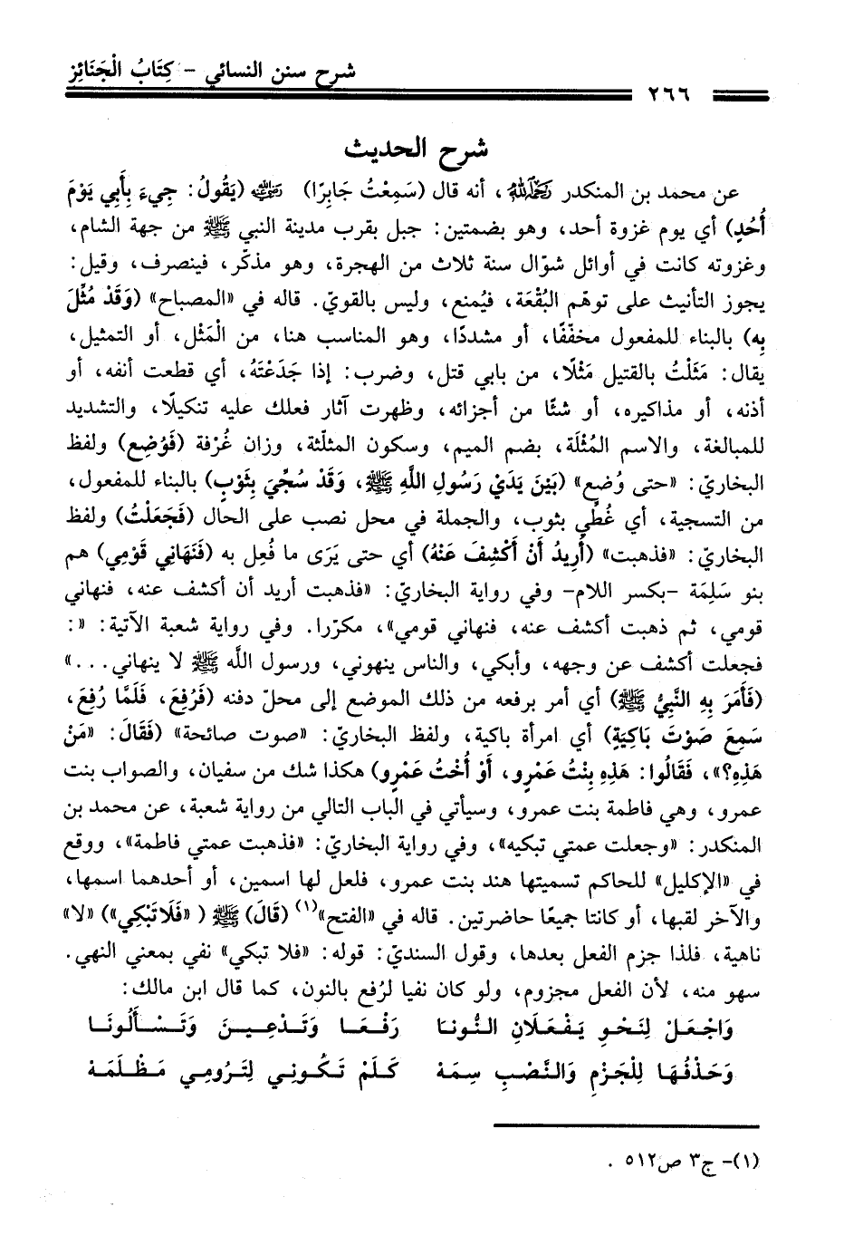 عن محمد بن المنكدر -رَحِمَهُ اللَّهُ-، أنه قال (سَمِعْتُ جَابِرًا) - رضي اللَّه عنه - (يَقُولُ: جِيءَ بِأَبِي يَوْمَ أُحُدٍ) أي يوم غزوة أحد، وهو بضمتين: جبل بقرب مدينة النبي - صلى اللَّه عليه وسلم - من جهة الشام، وغزوته كانت في أوائل شوّال سنة ثلاث من الهجرة، وهو مذكّر، فينصرف، وقيل: يجوز التأنيث على توهّم البُقْعَة، فيُمنع، وليس بالقويّ. قاله في "المصباح" (وَقَدْ مُثِّلَ بِه) بالبناء للمفعول مخفّفًا، أو مشددًا، وهو المناسب هنا، من الْمَثْل، أو التمثيل، يقال: مَثَلْتُ بالقتيل مَثْلًا، من بابي قتل، وضرب: إذا جَدَعْتَهُ، أي قطعت أنفه، أو أذنه، أو مذاكيره، أو شئًا من أجزائه، وظهرت آثار فعلك عليه تنكيلاً، والتشديد للمبالغة، والاسم المُثْلَة، بضم الميم، وسكون المثلّثة، وزان غُرْفة (فَوُضِع) ولفظ البخاريّ: "حتى وُضع" (بَينَ يَدَيْ رَسُولِ اللَّهِ - صلى اللَّه عليه وسلم -، وَقَدْ سُجِّيَ بِثَوْبٍ) بالبناء للمفعول، من التسجية، أي غُطِّي بثوب، والجملة في محل نصب علىَ الحَال (فَجَعَلْتُ) ولفظ البخاريّ: "فذهبت" (أُرِيدُ أَن أَكْشِفَ عَنْهُ) أي حتى يَرَى ما فُعِل به (فَنَهَانِي قَوْمِي) هم بنو سَلِمَة -بكسر اللام- وفي رواية البخاريّ: "فذهبت أريد أن أكشف عنه، فنهاني قومي، ثم ذهبت أكشف عنه، فنهاني قومي"، مكرّرا. وفي رواية شعبة الآتية: "فجعلت أكشف عن وجهه، وأبكي، والناس ينهوني، ورسول اللَّه - صلى اللَّه عليه وسلم - لا ينهاني ... "