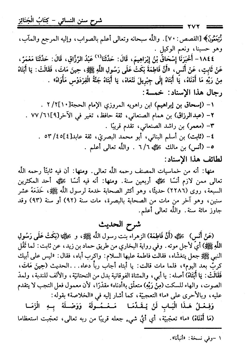 1844 - أَخْبَرَنَا إِسْحَاقُ بْنُ إِبْرَاهِيمَ, قَالَ: حَدَّثَنَا (¬1) عَبْدُ الرَّزَّاقِ, قَالَ: حَدَّثَنَا مَعْمَرٌ, عَنْ ثَابِتٍ, عَنْ أَنَسٍ, "أَنَّ فَاطِمَةَ بَكَتْ عَلَى رَسُولِ اللَّهِ - صلى اللَّه عليه وسلم -, حِينَ مَاتَ, فَقَالَتْ: يَا أَبَتَاهُ مِنْ رَبِّهِ مَا أَدْنَاهُ, يَا أَبَتَاهُ إِلَى جِبْرِيلَ نَنْعَاهُ, يَا أَبَتَاهُ جَنَّةُ الْفِرْدَوْسِ مَأْوَاهُ".