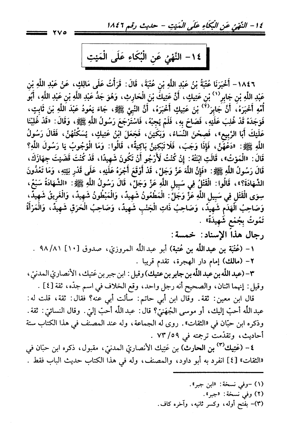 1846 - أَخْبَرَنَا عُتْبَةُ بْنُ عَبْدِ اللَّهِ بْنِ عُتْبَةَ, قَالَ: قَرَأْتُ عَلَى مَالِكٍ, عَنْ عَبْدِ اللَّهِ بْنِ عَبْدِ اللَّهِ بْنِ جَابِرِ (¬1) بْنِ عَتِيكٍ, أَنَّ عَتِيكَ بْنَ الْحَارِثِ, وَهُوَ جَدُّ عَبْدِ اللَّهِ بْنِ عَبْدِ اللَّهِ, أَبُو أُمِّهِ أَخْبَرَهُ, أَنَّ جَابِرَ (¬2) بْنَ عَتِيكٍ أَخْبَرَهُ, أَنَّ النَّبِيَّ - صلى اللَّه عليه وسلم -, جَاءَ يَعُودُ عَبْدَ اللَّهِ بْنَ ثَابِتٍ, فَوَجَدَهُ قَدْ غُلِبَ عَلَيْهِ, فَصَاحَ بِهِ, فَلَمْ يُجِبْهُ, فَاسْتَرْجَعَ رَسُولُ اللَّهِ - صلى اللَّه عليه وسلم -, وَقَالَ: «قَدْ غُلِبْنَا عَلَيْكَ أَبَا الرَّبِيعِ». فَصِحْنَ النِّسَاءُ, وَبَكَيْنَ, فَجَعَلَ ابْنُ عَتِيكٍ, يُسَكِّتُهُنَّ, فَقَالَ رَسُولُ اللَّهِ - صلى اللَّه عليه وسلم - «دَعْهُنَّ, فَإِذَا وَجَبَ, فَلاَ تَبْكِيَنَّ بَاكِيَةٌ» , قَالُوا: وَمَا الْوُجُوبُ يَا رَسُولَ اللَّهِ؟ قَالَ: «الْمَوْتُ». قَالَتِ ابْنَتُهُ: إِنْ كُنْتُ لأَرْجُو أَنْ تَكُونَ شَهِيدًا, قَدْ كُنْتَ قَضَيْتَ جِهَازَكَ, قَالَ: رَسُولُ اللَّهِ - صلى اللَّه عليه وسلم -: «فَإِنَّ اللَّهَ -عَزَّ وَجَلَّ-, قَدْ أَوْقَعَ أَجْرَهُ عَلَيْهِ, عَلَى قَدْرِ نِيَّتِهِ, وَمَا تَعُدُّونَ الشَّهَادَةَ؟». قَالُوا: الْقَتْلُ فِي سَبِيلِ اللَّهِ -عَزَّ وَجَلَّ-, قَالَ رَسُولُ اللَّهِ - صلى اللَّه عليه وسلم -: «الشَّهَادَةُ سَبْعٌ, سِوَى الْقَتْلِ فِي سَبِيلِ اللَّهِ -عَزَّ وَجَلَّ-: الْمَطْعُونُ شَهِيدٌ, وَالْمَبْطُونُ شَهِيدٌ, وَالْغَرِيقُ شَهِيدٌ, وَصَاحِبُ الْهَدْمِ شَهِيدٌ, وَصَاحِبُ ذَاتِ الْجَنْبِ شَهِيدٌ, وَصَاحِبُ الْحَرَقِ شَهِيدٌ, وَالْمَرْأَةُ تَمُوتُ بِجُمْعٍ شَهِيدَةٌ».