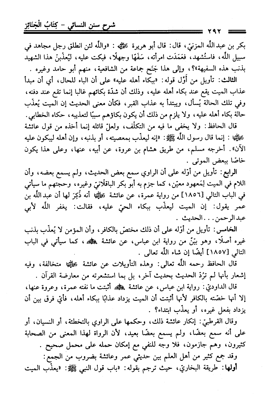 الرابع: تأويل من أوله على أن الراوي سمع بعض الحديث، ولم يسمع بعضه، وأن اللام في الميت لِمَعهود معين، كما جزم به أبو بكر الباقلاّنيّ وغيره، وحجتهم ما سيأتي في الباب التالي [1856]، من رواية عمرة، عن عائشة - رضي اللَّه عنها - أنه ذُكِرَ لها أن عبد اللَّه بن عمر يقول: إن الميت ليعذّب ببكاء الحي عليه، فقالت: يغفر اللَّه لأبي عبد الرحمن ... الحديث.