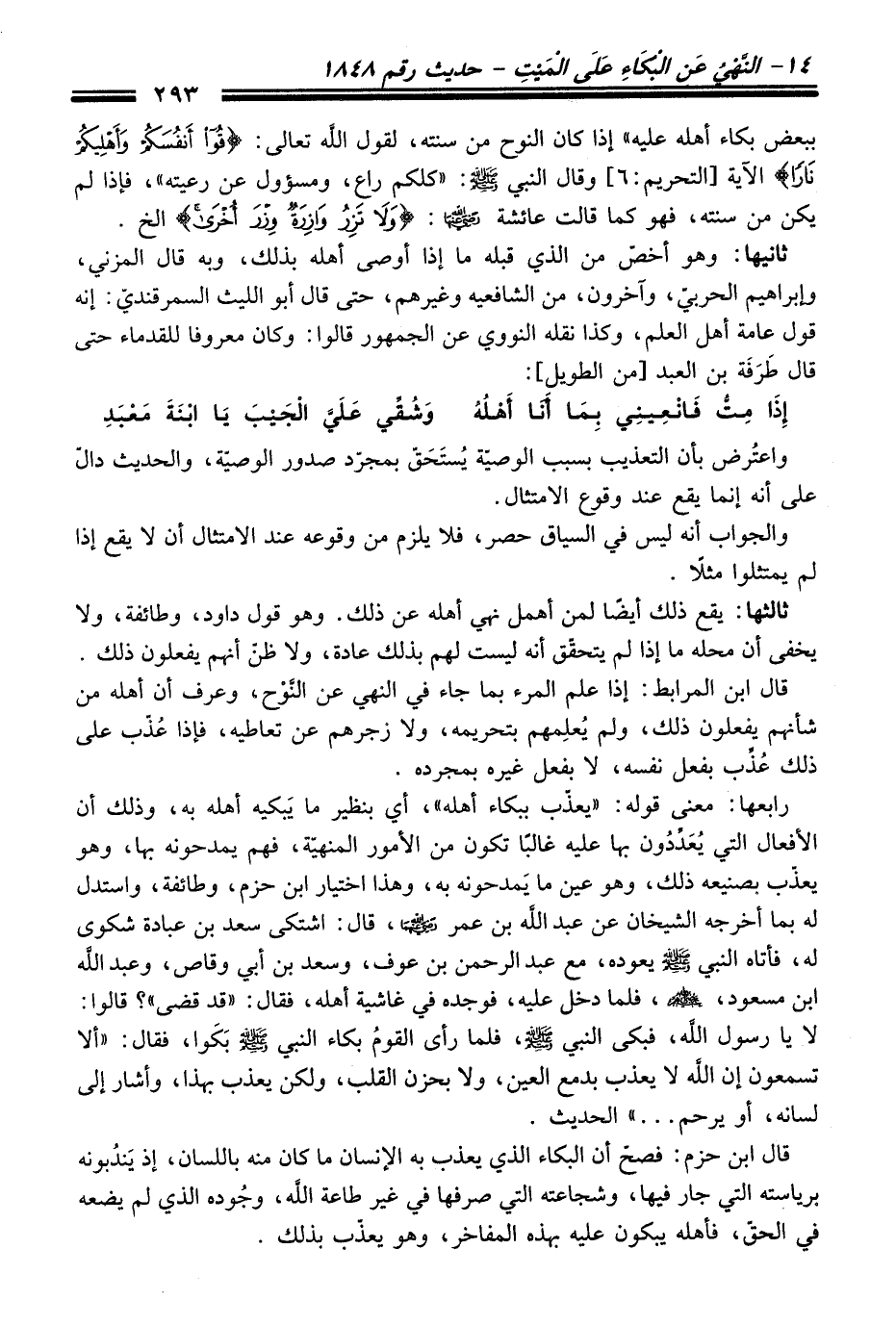 رابعها: معنى قوله: "يعذّب ببكاء أهله"، أي بنظير ما يَبكيه أهله به، وذلك أن الأفعال التي يُعَدِّدُون بها عليه غالبًا تكون من الأمور المنهيّة, فهم يمدحونه بها، وهو يعذّب بصنيعه ذلك، وهو عين ما يَمدحونه به، وهذا اختيار ابن حزم، وطائفة، واستدل له بما أخرجه الشيخان عن عبد اللَّه بن عمر - رضي اللَّه عنه -، قال: اشتكى سعد بن عبادة شكوى له، فأتاه النبي - صلى اللَّه عليه وسلم - يعوده، مع عبد الرحمن بن عوف، وسعد بن أبى وقاص، وعبد اللَّه ابن مسعود، - رضي الله عنهم -، فلما دخل عليه، فوجده في غاشية أهله، فقال: "قد قضى"؟ قالوا: لا يا رسول اللَّه، فبكى النبي - صلى اللَّه عليه وسلم -، فلما رأى القومُ بكاء النبي - صلى اللَّه عليه وسلم - بَكَوا، فقال: "ألا تسمعون إن اللَّه لا يعذب بدمع العين، ولا بحزن القلب، ولكن يعذب بهذا، وأشار إلى لسانه، أو يرحم ... " الحديث.