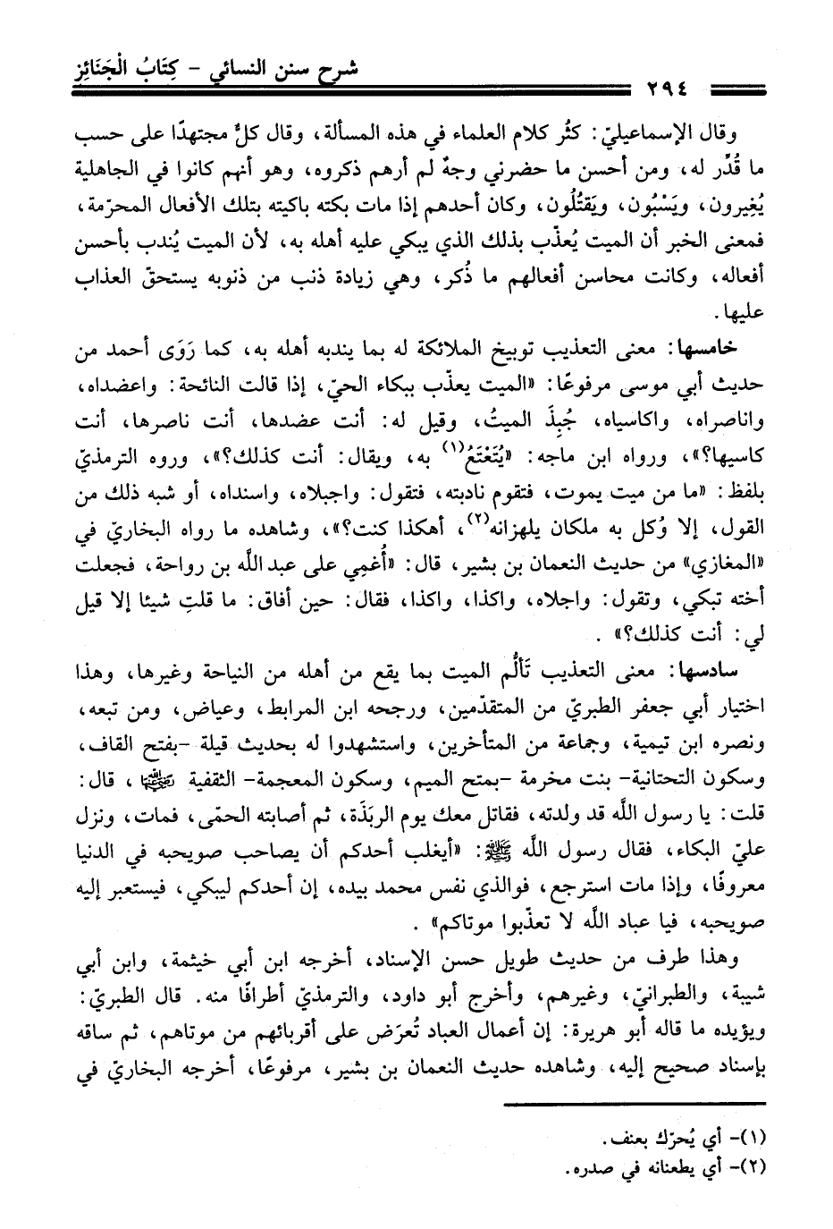 وقال الإسماعيلي: كثُر كلام العلماء في هذه المسألة، وقال كلُّ مجتهدًا على حسب ما قُدِّر له، ومن أحسن ما حضرني وجهٌ لم أرهم ذكروه، وهو أنهم كانوا في الجاهلية يُغِيرون، وَيسْبون، ويَقتُلُون، وكان أحدهم إذا مات بكته باكيته بتلك الأفعال المحرّمة، فمعنى الخبر أن الميت يُعذّب بذلك الذي يبكي عليه أهله به، لأن الميت يُندب بأحسن أفعاله، وكانت محاسن أفعالهم ما ذُكر، وهي زيادة ذنب من ذنوبه يستحقّ العذاب عليها.