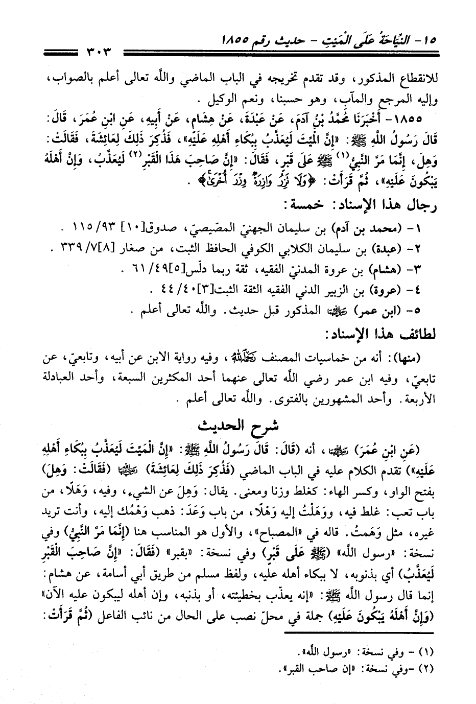 1855 - أَخْبَرَنَا مُحَمَّدُ بْنُ آدَمَ, عَنْ عَبْدَةَ, عَنْ هِشَامٍ, عَنْ أَبِيهِ, عَنِ ابْنِ عُمَرَ, قَالَ: قَالَ رَسُولُ اللَّهِ - صلى اللَّه عليه وسلم -: «إِنَّ الْمَيِّتَ لَيُعَذَّبُ بِبُكَاءِ أَهْلِهِ عَلَيْهِ» , فَذُكِرَ ذَلِكَ لِعَائِشَةَ, فَقَالَتْ: وَهِلَ, إِنَّمَا مَرَّ النَّبِيُّ (¬1) - صلى اللَّه عليه وسلم - عَلَى قَبْرٍ, فَقَالَ: «إِنَّ صَاحِبَ الْقَبْرِ (¬2) لَيُعَذَّبُ, وَإِنَّ أَهْلَهُ يَبْكُونَ عَلَيْهِ». ثُمَّ قَرَأَتْ: (وَلاَ تَزِرُ وَازِرَةٌ وِزْرَ أُخْرَى).