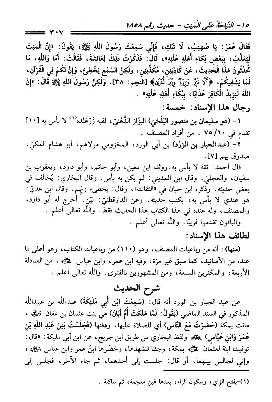 فَقَالَ عُمَرُ: يَا صُهَيْبُ, لاَ تَبْكِ, فَإِنِّي سَمِعْتُ رَسُولَ اللَّهِ - صلى اللَّه عليه وسلم -, يَقُولُ: «إِنَّ الْمَيِّتَ لَيُعَذَّبُ, بِبَعْضِ بُكَاءِ أَهْلِهِ عَلَيْهِ» , قَالَ: فَذَكَرْتُ ذَلِكَ لِعَائِشَةَ, فَقَالَتْ: أَمَا وَاللَّهِ مَا تُحَدِّثُونَ هَذَا الْحَدِيثَ, عَنْ كَاذِبَيْنِ, مُكَذَّبَيْنِ, وَلَكِنَّ السَّمْعَ يُخْطِئُ, وَإِنَّ لَكُمْ فِي الْقُرْآنِ, لَمَا يَشْفِيكُمْ, {أَلَّا تَزِرُ وَازِرَةٌ وِزْرَ أُخْرَى} [النجم: 38] , وَلَكِنَّ رَسُولَ اللَّهِ - صلى اللَّه عليه وسلم - قَالَ: «إِنَّ اللَّهَ لَيَزِيدُ الْكَافِرَ عَذَابًا, بِبُكَاءِ أَهْلِهِ عَلَيْهِ».