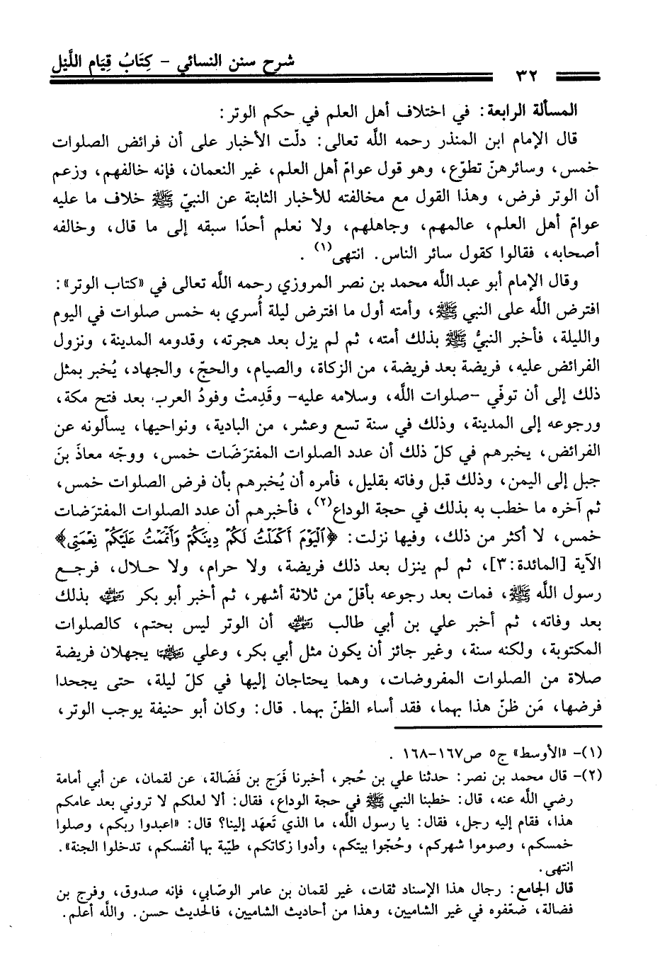 وقال الإمام أبو عبد اللَّه محمد بن نصر المروزي -رحمه اللَّه تعالى- في "كتاب الوتر": افترض اللَّه على النبي - صلى اللَّه عليه وسلم -، وأمته أول ما افترض ليلة أُسري به خمس صلوات في اليوم والليلة، فأخبر النبيُّ - صلى اللَّه عليه وسلم - بذلك أمته، ثم لم يزل بعد هجرته، وقدومه المدينة، ونزول الفرائض عليه، فريضة بعد فريضة، من الزكاة، والصيام، والحج، والجهاد، يُخبر بمثل ذلك إلى أن توفّي- صلوات اللَّه، وسلامه عليه- وقَدِمتْ وفودُ العرب، بعد فتح مكة، ورجوعه إلى المدينة، وذلك في سنة تسع وعشر، من البادية، ونواحيها، يسألونه عن الفرائض، يخبرهم في كلّ ذلك أن عدد الصلوات المفترَضَات خمس، ووجّه معاذَ بنَ جبل إلى اليمن، وذلك قبل وفاته بقليل، فأمره أن يُخبرهم بأن فرض الصلوات خمس، ثم آخره ما خطب به بذلك في حجة الوداع (¬2)، فأخبرهم أن عدد الصلوات المفترَضات خمس، لا أكثر من ذلك، وفيها نزلت: {الْيَوْمَ أَكْمَلْتُ لَكُمْ دِينَكُمْ وَأَتْمَمْتُ عَلَيْكُمْ نِعْمَتِي} الآية [المائدة: 3]، ثم لم ينزل بعد ذلك فريضة، ولا حرام، ولا حلال، فرجع رسول اللَّه - صلى اللَّه عليه وسلم -، فمات بعد رجوعه بأقلّ من ثلاثة أشهر، ثم أخبر أبو بكر - رضي اللَّه عنه - بذلك بعد وفاته، ثم أخبر علي بن أبي طالب - رضي اللَّه عنه - أن الوتر ليس بحتم، كالصلوات المكتوبة، ولكنه سنة، وغير جائز أن يكون مثل أبي بكر، وعلي - رضي اللَّه عنهما - يجهلان فريضة صلاة من الصلوات المفروضات، وهما يحتاجان إليها في كلّ ليلة، حتى يجحدا فرضها، مَن ظنّ هذا بهما، فقد أساء الظنّ بهما. قال: وكان أبو حنيفة يوجب الوتر،