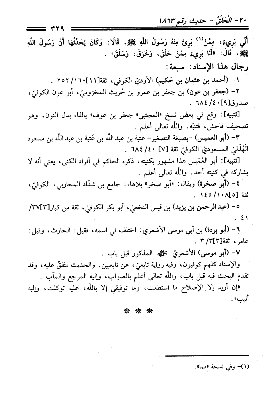 والإسناد كلهم كوفيون، وفيه رواية تابعيّ، عن تابعيين. والحديث متّفقٌ عليه، وقد تقدم البحث فيه قبل باب، واللَّه تعالى أعلم بالصواب، وإليه المرجع والمآب.