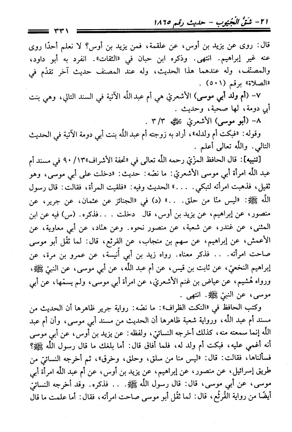 [تنبيه]: قال الحافظ المزّيّ -رحمه اللَّه تعالى- في "تحفة الأشراف" 13/ 90 في مسند أم عبد اللَّه امرأة أبي موسى الأشعريّ: ما نصّه: حديث: "دخلت على أبي موسى، وهو ثقيل، فذهبت امرأته لتبكي .... " الحديث وفيه: "فلقيت المرأة، فقالت: قال رسول اللَّه - صلى اللَّه عليه وسلم -: "ليس منّا من حلق ... " (د) في "الجنائز عن عثمان، عن جرير، عن منصور، عن إبراهيم، عن يزيد بن أوس، قال دخلت ... فذكره. (س) فيه عن ابن المثنى، عن غندر، عن شعبة، عن مصور نحوه. وعن هنّاد، عن أبي معاوية، عن الأعمش، عن إبراهيم، عن سهم بن منجاب، عن القرثع، قال. لما ثقُل أبو موسى
