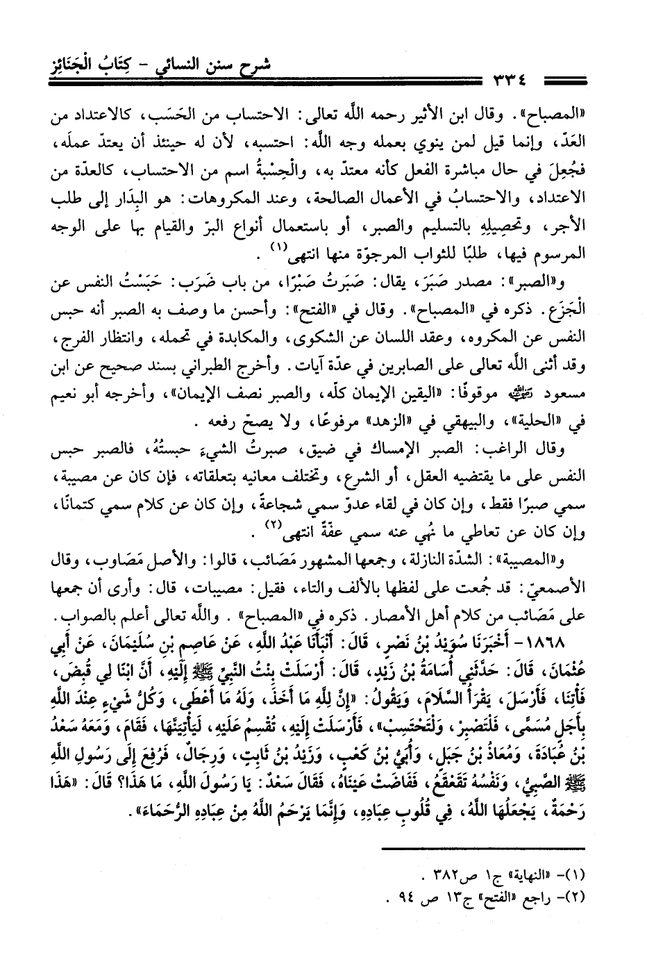 و"الصبر": مصدر صَبَرَ، يقال: صَبَرتُ صَبْرًا، من باب ضَرَب: حَبَسْتُ النفس عن الْجَزَع. ذكره في "المصباح". وقال في "الفتح": وأحسن ما وصف به الصبر أنه حبس النفس عن المكروه، وعقد اللسان عن الشكوى، والمكابدة في تحمله، وانتظار الفرج، وقد أثنى اللَّه تعالى على الصابرين في عدّة آيات. وأخرج الطبراني بسند صحيح عن ابن مسعود - رضي اللَّه عنه - موقوفًا: "اليقين الإيمان كلّه، والصبر نصف الإيمان"، وأخرجه أبو نعيم في "الحلية"، والبيهقي في "الزهد" مرفوعًا، ولا يصحّ رفعه.
