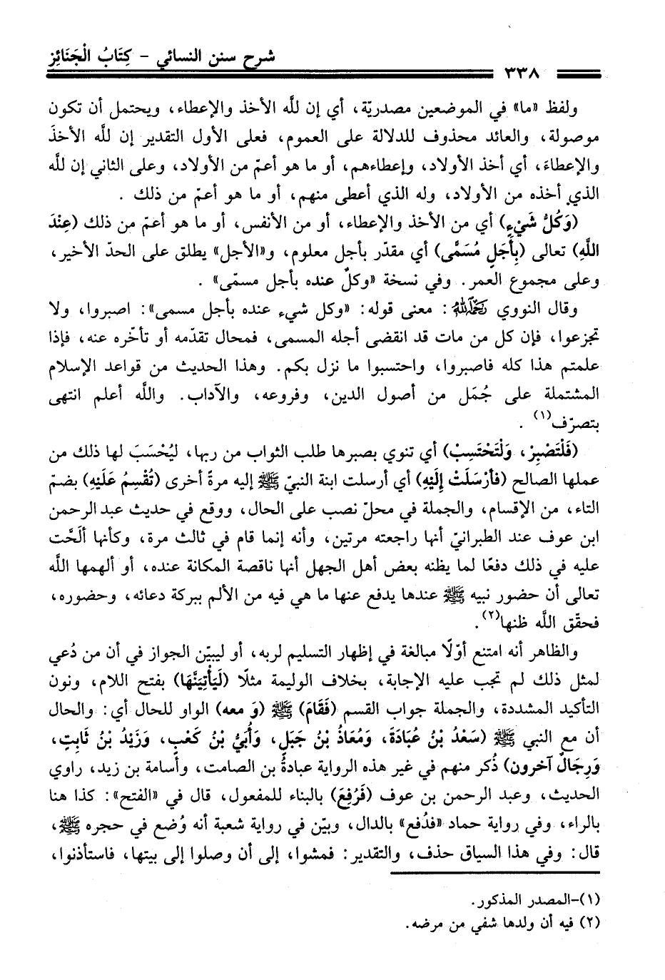وقال النووي -رَحِمَهُ اللَّهُ-: معنى قوله: "وكل شيء عنده بأجل مسمى": اصبروا، ولا تجزعوا، فمن كل من مات قد انقضى أجله المسمى، فمحال تقدّمه أو تأخّره عنه، فإذا علمتم هذا كله فاصبروا، واحتسبوا ما نزل بكم. وهذا الحديث من قواعد الإسلام المشتملة على جُمَل من أصول الدين، وفروعه، والآداب. واللَّه أعلم انتهى بتصرّف (¬1). (فَلْتَصْبِرْ، وَلْتَحْتَسِبْ) أي تنوي بصبرها طلب الثواب من ربها، ليُحْسَبَ لها ذلك من عملها الصالح (فأرْسَلَتْ إِلَيهِ) أي أرسلت ابنة النبيّ - صلى اللَّه عليه وسلم - إليه مرةً أخرى (تُقْسِمُ عَلَيْهِ) بضمّ التاء، من الإقسام، والجملة في محلّ نصب على الحال، ووقع في حديث عبد الرحمن ابن عوف عند الطبرانيّ أنها راجعته مرتين، وأنه إنما قام في ثالث مرة، وكأنها ألَحَّت عليه في ذلك دفعًا لما يظنه بعض أهل الجهل أنها ناقصة المكانة عنده، أو ألهمها اللَّه تعالى أن حضور نبيه - صلى اللَّه عليه وسلم - عندها يدفع عنها ما هي فيه من الألم ببركة دعائه، وحضوره، فحقّق اللَّه ظنها (¬2).