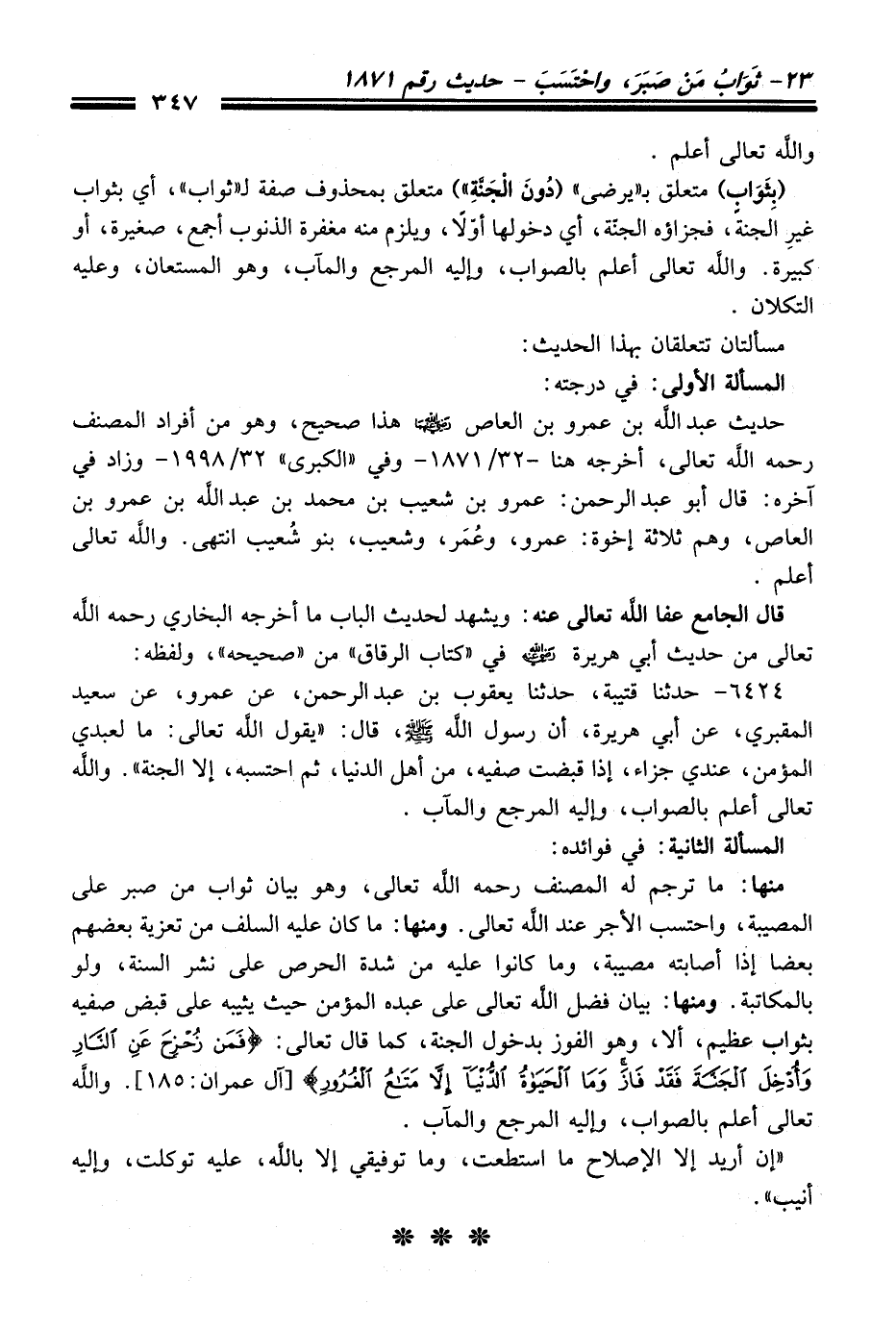 6424 - حدثنا قتيبة، حدثنا يعقوب بن عبدالرحمن، عن عمرو، عن سعيد المقبري، عن أبي هريرة، أن رسول اللَّه - صلى اللَّه عليه وسلم -، قال: "يقول اللَّه تعالى: ما لعبدي المؤمن، عندي جزاء، إذا قبضت صفيه، من أهل الدنيا، ثم احتسبه، إلا الجنة". واللَّه تعالى أعلم بالصواب، وإليه المرجع والمآب.