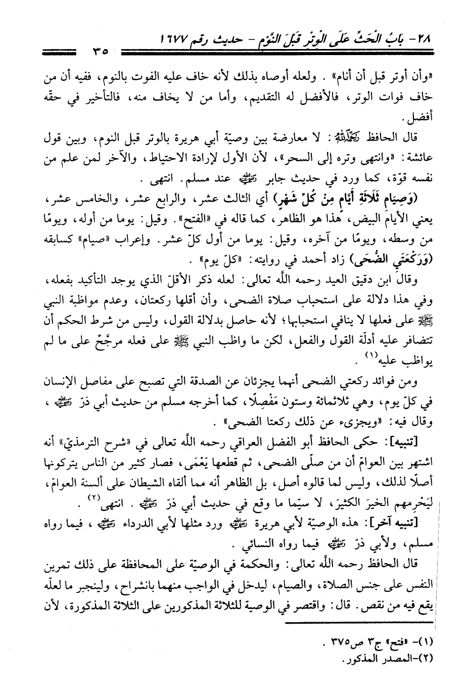 [تنبيه]: حكى الحافظ أبو الفضل العراقي -رحمه اللَّه تعالى- في "شرح الترمذيّ" أنه اشتهر بين العوامّ أن من صلّى الضحى، ثم قطعها يَعْمَى، فصار كثير من الناس يتركونها أصلاً لذلك، وليس لما قالوه أصل، بل الظاهر أنه مما ألقاه الشيطان على ألسنة العوامّ، ليَحْرِمهم الخيرَ الكثيرَ، لا سيّما ما وقع في حديث أبي ذرّ - رضي اللَّه عنه - انتهى (¬2).