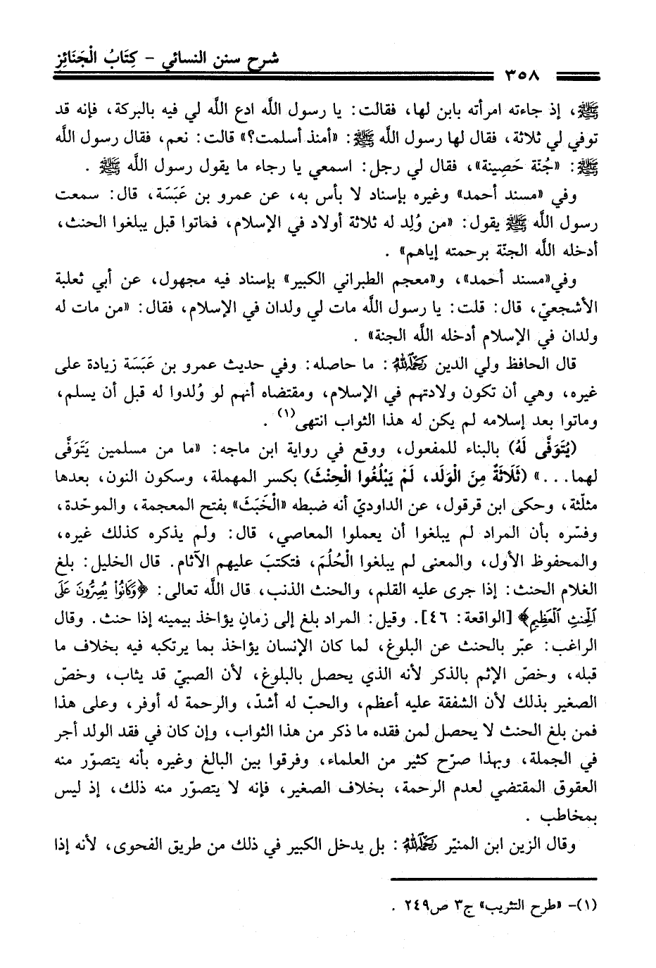 قال الحافظ ولي الدين -رَحِمَهُ اللَّهُ-: ما حاصله: وفي حديث عمرو بن عَبَسَة زيادة على غيره، وهي أن تكون ولادتهم في الإسلام، ومقتضاه أنهم لو وُلدوا له قبل أن يسلم، وماتوا بعد إسلامه لم يكن له هذا الثواب انتهى (¬1).