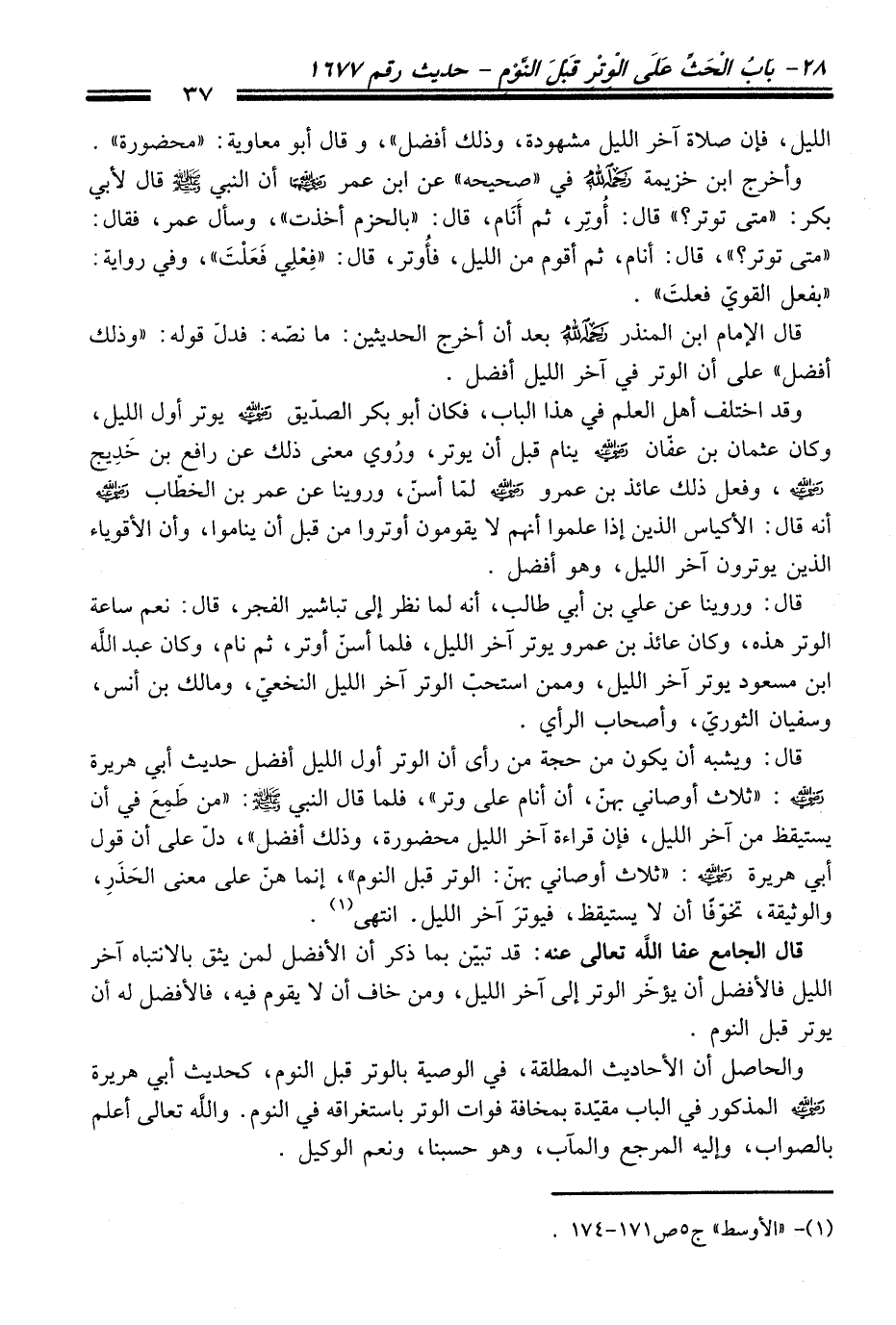وقد اختلف أهل العلم في هذا الباب، فكان أبو بكر الصدّيق - رضي اللَّه عنه - يوتر أول الليل، وكان عثمان بن عفّان - رضي اللَّه عنه - ينام قبل أن يوتر، ورُوي معنى ذلك عن رافع بن خَدِيج - رضي اللَّه عنه -، وفعل ذلك عائذ بن عمرو - رضي اللَّه عنه - لمّا أسنّ، وروينا عن عمر بن الخطّاب - رضي اللَّه عنه - أنه قال: الأكياس الذين إذا علموا أنهم لا يقومون أوتروا من قبل أن يناموا، وأن الأقوياء الذين يوترون آخر الليل، وهو أفضل.