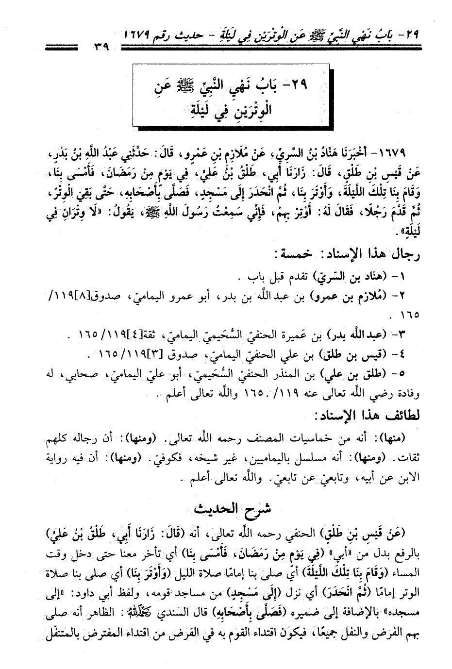 1679 - أَخْبَرَنَا هَنَّادُ بْنُ السَّرِيِّ, عَنْ مُلاَزِمِ بْنِ عَمْرٍو, قَالَ: حَدَّثَنِي عَبْدُ اللَّهِ بْنُ بَدْرٍ, عَنْ قَيْسِ بْنِ طَلْقٍ, قَالَ: زَارَنَا أَبِي, طَلْقُ بْنُ عَلِيٍّ, فِي يَوْمٍ مِنْ رَمَضَانَ, فَأَمْسَى بِنَا, وَقَامَ بِنَا تِلْكَ اللَّيْلَةَ, وَأَوْتَرَ بِنَا, ثُمَّ انْحَدَرَ إِلَى مَسْجِدٍ, فَصَلَّى بِأَصْحَابِهِ, حَتَّى بَقِيَ الْوِتْرُ, ثُمَّ قَدَّمَ رَجُلاً, فَقَالَ لَهُ: أَوْتِرْ بِهِمْ, فَإِنِّي سَمِعْتُ رَسُولَ اللَّهِ - صلى اللَّه عليه وسلم -, يَقُولُ: «لاَ وِتْرَانِ فِي لَيْلَةٍ».