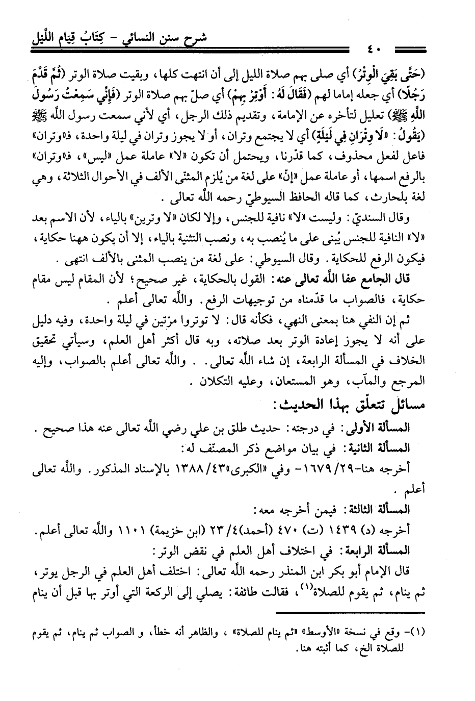 وقال السنديّ: وليست "لا" نافية للجنس، وإلا لكان "لا وترين" بالياء؛ لأن الاسم بعد "لا" النافية للجنس يُبنى على ما يُنصب به، ونصب التثنية بالياء، إلا أن يكون ههنا حكاية، فيكون الرفع للحكاية. وقال السيوطي: على لغة من ينصب المثنى بالألف انتهى.
