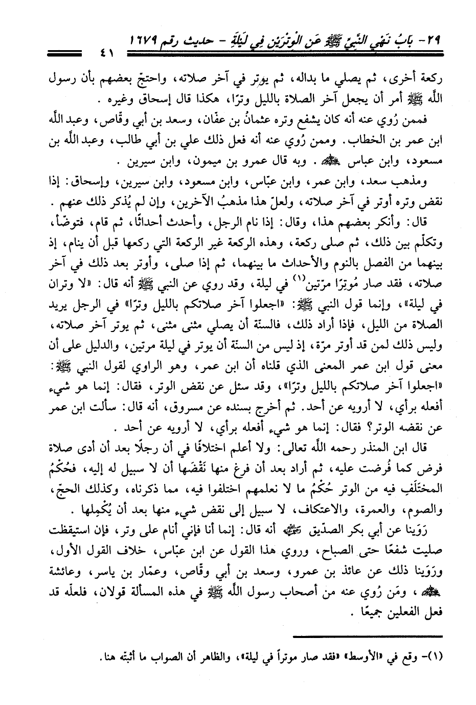 قال: وأنكر بعضهم هذا، وقال: إذا نام الرجل، وأحدث أحداثًا، ثم قام، فتوضّأ، وتكلّم بين ذلك، ثم صلى ركعة، وهذه الركعة غير الركعة التي ركعها قبل أن ينام، إذ بينهما من الفضل بالنوم والأحداث ما بينهما، ثم إذا صلى، وأوتر بعد ذلك في آخر صلاته، فقد صار مُوتِرًا مرّتين (¬1) في ليلة، وقد روي عن النبي - صلى اللَّه عليه وسلم - أنه قال: "لا وتران في ليلة"، وإنما قول النبي - صلى اللَّه عليه وسلم -: "اجعلوا آخر صلاتكم بالليل وترًا" في الرجل يريد الصلاة من الليل، فإذا أراد ذلك، فالسنّة أن يصلي مثنى مثنى، ثم يوتر آخر صلاته، وليس ذلك لمن قد أوتر مرّة، إذ ليس من السنّة أن يوتر في ليلة مرتين، والدليل على أن معنى قول ابن عمر المعنى الذي قلناه أن ابن عمر، وهو الراوي لقول النبي - صلى اللَّه عليه وسلم -: "اجعلوا آخر صلاتكم بالليل وترًا"، وقد سئل عن نقض الوتر، فقال: إنما هو شيء أفعله برأي، لا أرويه عن أحد. ثم أخرج بسنده عن مسروق، أنه قال: سألت ابن عمر عن نقضه الوتر؟ فقال: إنما هو شيء أفعله برأي، لا أرويه عن أحد.