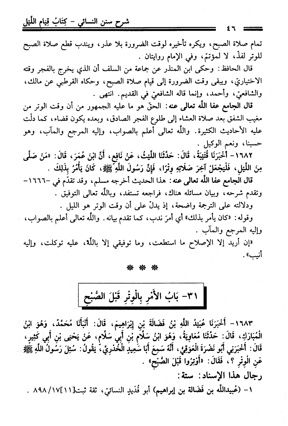 1682 - أَخْبَرَنَا قُتَيْبَةُ, قَالَ: حَدَّثَنَا اللَّيْثُ, عَنْ نَافِعٍ, أَنَّ ابْنَ عُمَرَ, قَالَ: "مَنْ صَلَّى مِنَ اللَّيْلِ, فَلْيَجْعَلْ آخِرَ صَلاَتِهِ وَتْرًا, فَإِنَّ رَسُولَ اللَّهِ - صلى اللَّه عليه وسلم -, كَانَ يَأْمُرُ بِذَلِكَ.