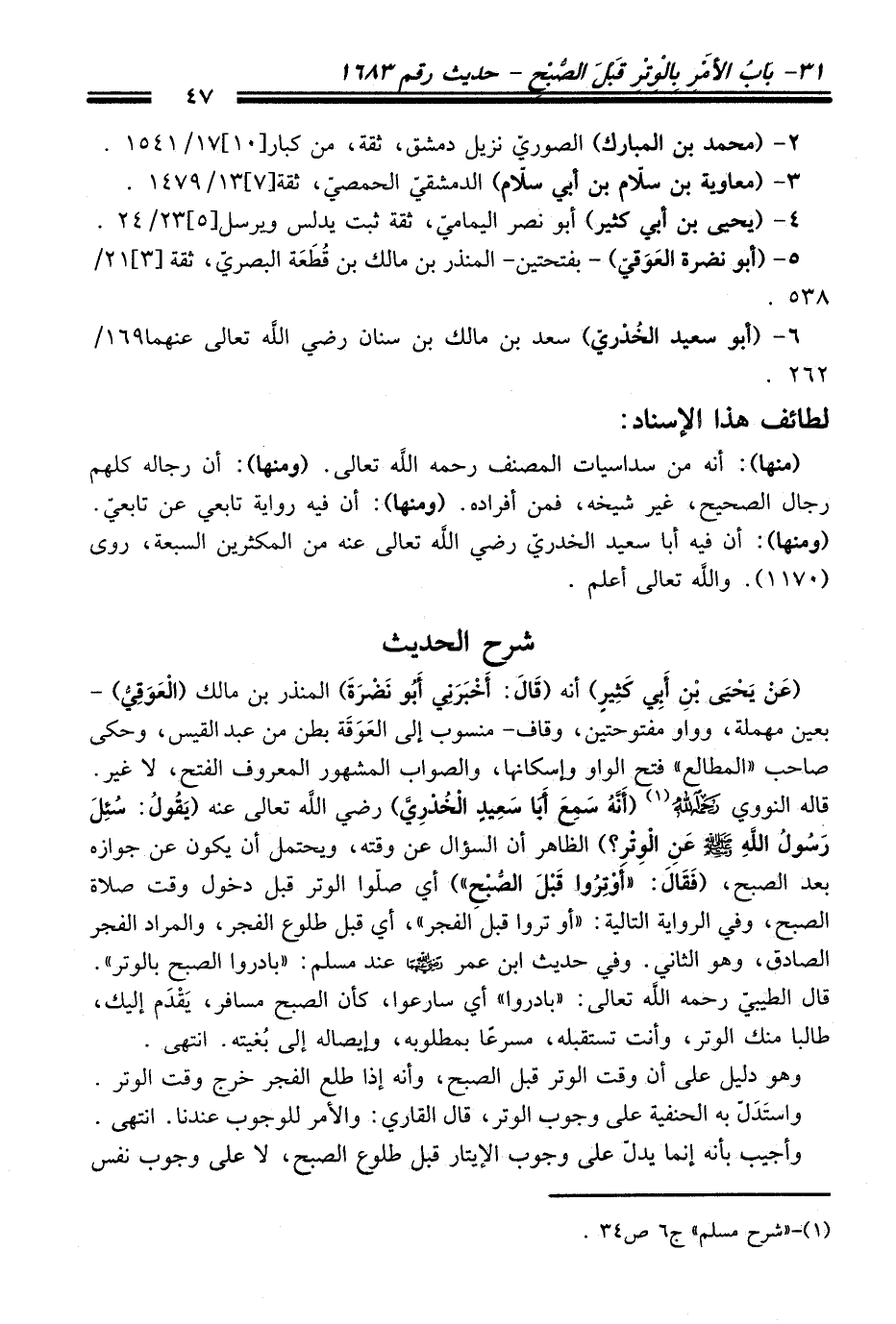 قاله النووي -رَحِمَهُ اللَّهُ- (¬1) (أَنهُ سَمِعَ أَبا سَعِيدِ الْخُدرِيَّ) - رضي اللَّه تعالى عنه - (يَقُولُ: سُئِلَ رسُولُ اللَّهِ - صلى اللَّه عليه وسلم - عَنِ الْوِتْرِ؟) الظاهر أن السؤال عن وقته، ويحتمل أن يكون عن جوازه بعد الصبح، (فَقَالَ: "أَوْتِرُوا - قَبْلَ الصُّبْحِ") أي صلّوا الوتر قبل دخول وقت صلاة الصبح، وفي الرواية التالية: "أوتروا قبل الفجر"، أي قبل طلوع الفجر، والمراد الفجر الصادق، وهو الثاني. وفي حديث ابن عمر - رضي اللَّه عنه - عند مسلم: "بادروا الصبح بالوتر". قال الطيبيّ -رحمه اللَّه تعالى-: "بادروا" أي سارعوا، كأن الصبح مسافر، يَقْدَم إليك، طالبا منك الوتر، وأنت تستقبله، مسرعًا بمطلوبه، وإيصاله إلى بُغيته. انتهى.