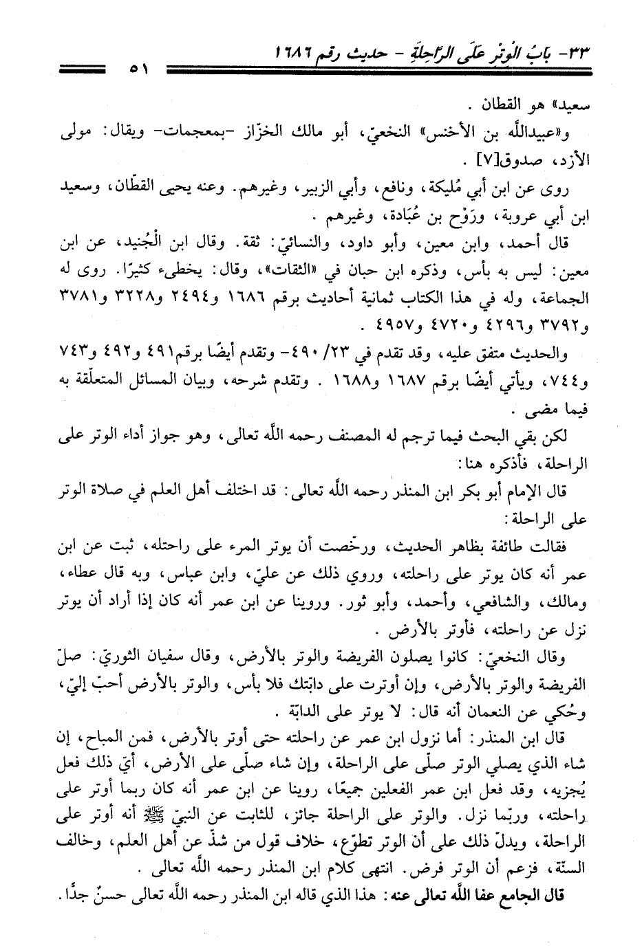 قال ابن المنذر: أما نزول ابن عمر عن راحلته حتى أوتر بالأرض، فمن المباح، إن شاء الذي يصلي الوتر صلّى على الراحلة، وإن شاء صلّى على الأرض، أيّ ذلك فعل يُجزيه، وقد فعل ابن عمر الفعلين جميعًا، روينا عن ابن عمر أنه كان ربما أوتر على راحلته، وربّما نزل. والوتر على الراحلة جائز، للثابت عن النبيّ - صلى اللَّه عليه وسلم - أنه أوتر على الراحلة، ويدلّ ذلك على أن الوتر تطوّع، خلاف قول من شذّ عن أهل العلم، وخالف السنّة، فزعم أن الوتر فرض. انتهى كلام ابن المنذر -رحمه اللَّه تعالى-.