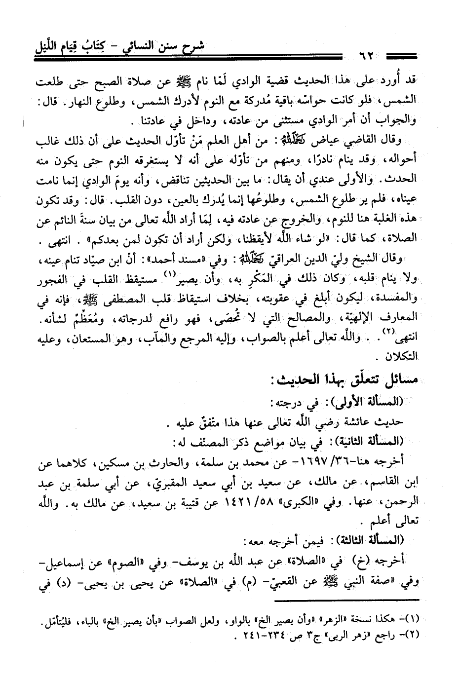 قد أُورد على هذا الحديث قضية الوادي لَمّا نام - صلى اللَّه عليه وسلم - عن صلاة الصبح حتى طلعت الشمس، فلو كانت حواسّه. باقية مُدركة مع النوم لأدرك الشمس، وطلوع النهار. قال: والجواب أن أمر الوادي مستثنى من عادته، وداخل في عادتنا.