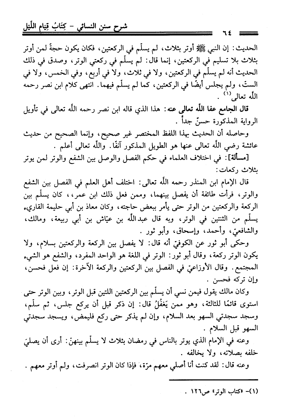 الحديث: إن النبي - صلى اللَّه عليه وسلم - أوتر بثلاث، لم يسلّم في الركعتين، فكان يكون حجةً لمن أوتر بثلاث بلا تسليم في الركعتين، إنما قال: لم يسلّم في ركعتي الوتر، وصدق في ذلك الحديث أنه لم يسلّم في الركعتين، ولا في ثلاث، ولا في أربع، وفي الخمس، ولا في الستّ، ولم يجلس أيضًا في الركعتين، كما لم يسلّم فيهما. انتهى كلام ابن نصر -رحمه اللَّه تعالى- (¬1).