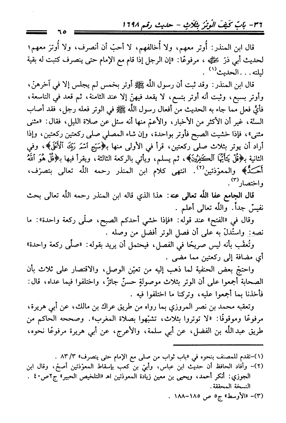 وتعقبه محمد بن نصر المروزي بما رواه من طريق عراك بن مالك، عن أبي هريرة، مرفوعًا وموقوفًا: "لا توتروا بثلاث، تشبّهوا بصلاة المغرب". وصححه الحاكم من طريق عبد اللَّه بن الفضل، عن أبي سلمة، والأعرج، عن أبي هريرة مرفوعًا نحوه،