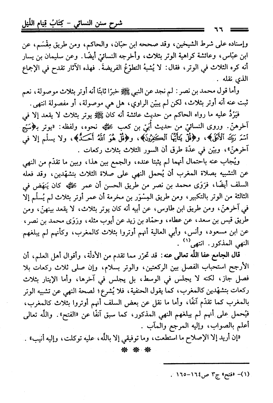 قال الجامع - عفا اللَّه تعالى عنه -: قد تحرّر مما تقدّم من الأدلّة، وأقوال أهل العلم، أن الأرجح استحباب الفضل بين الركعتين، والوتر بسلام، وإن صلى ثلاث ركعات بلا فصل جاز، لكنه لا يجلس في الوسط، بل يجلس في آخرها، وأما الإيتار بثلاث ركعات بتشهّدين كالمغرب، كما يقول الحنفية، فلا يُشرع؛ لصحة النهي عن تشبيه الوتر بالمغرب كما تقدّم آنفًا، وأما ما نقل عن بعض السلف أنهم أوتروا بثلاث كالمغرب، فيُحمل على أنهم لم يبلغهم النهي المذكور، كما سبق آنفًا عن "الفتح". واللَّه تعالى أعلم بالصواب، وإليه المرجع والمآب.