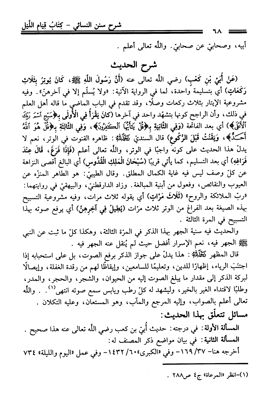 (عَن أُبَيِّ بْنِ كَعْبٍ) - رضي اللَّه تعالى عنه - (أَنَّ رَسُولَ اللَّهِ - صلى اللَّه عليه وسلم -، كَانَ يُوتِرُ بِثَلَاثِ رَكَعَاتٍ) أي بتسليمةَ واحدة، لما في الرواية الآتية: "ولا يُسلّم إلا في آخرهنّ". وفيه مشروعية الإيتار بثلاث ركعات وصلاً، وقد تقدّم في الباب الماضى ما قاله أهل العلم في ذلك، وأن الراجح كونها بتشهّد واحد في آخرها (كانَ يَقْرَأُ فِي الْأولَى بِـ {سَبِّحِ اسْمَ رَبِّكَ الْأَعْلَى} أي بعد الفاتحة (وَفِي الثَّانِيَةِ بِـ {قُلْ يَا أَيُّهَا الْكَافِرُونَ}، وَفِي الثالِثَةِ بِـ {قُل هُوَ اَللهُ أَحَدٌ}، وَيَقْنُتُ قَبْلَ الرُّكُوعِ) قال السنديّ -رَحِمَهُ اللَّهُ-: ظاهره القنوت في الوتر، نعم لا يدلّ هذا الحديث على كونه واجبًا في الوتر، واللَّه تعالى أعلم (فَإِذَا فَرَغَ، قَالَ: عِنْدَ فَرَاغِهِ) أي بعد التسليم، كما يأتي قريبًا (سُبْحَانَ المَلِكِ الْقُدُّوسِ) أي البالغ أقصى النزاهة عن كلّ وصف ليس فيه غاية الكمال المطلق. وقال الطيبيّ: هو الطاهر المنزّه عن العيوب والنقائص، وفعول من أبنية المبالغة. وزاد الدارقطنيّ، والبيهقيّ في روايتهما: "ربّ الملائكة والروح" (ثَلَاثَ مَرَّاتٍ) أي يقوله ثلاث مرات، وفيه مشروعية التسبيح بهذه الصيغة بعد الفراغ من الوتر ثلاث مرات (يُطِيلُ فِي آخِرِهِنَّ) أي يرفع صوته بهذا التسبيح في المرة الثالثة.