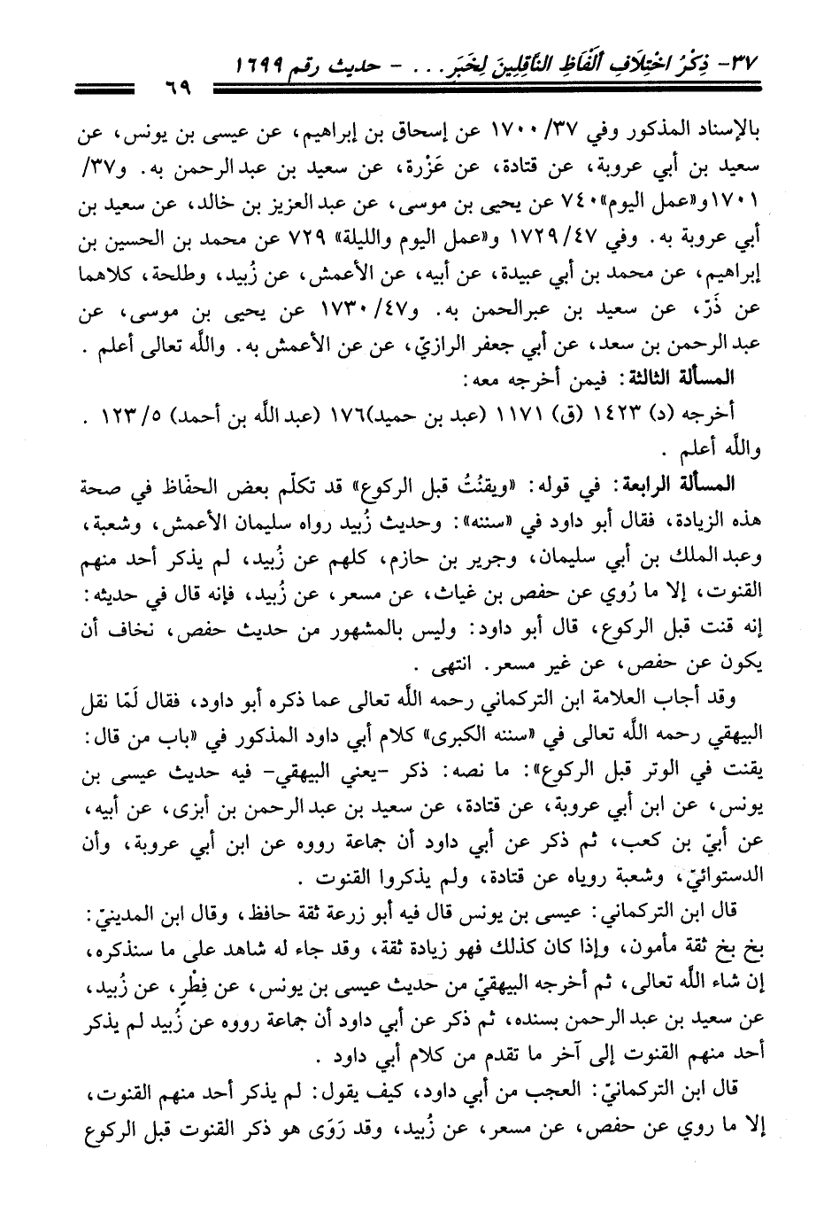 قال ابن التركمانيّ: العجب من أبي داود، كيف يقول: لم يذكر أحد منهم القنوت، إلا ما روي عن حفص، عن مسعر، عن زُبيد، وقد رَوَى هو ذكر القنوت قبل الركوع