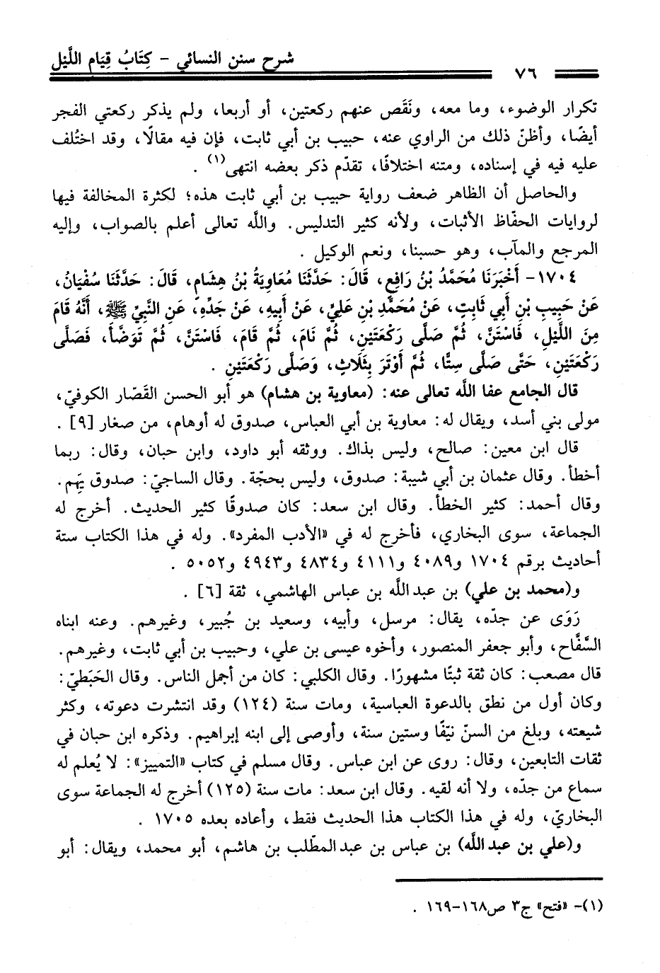 1704 - أَخْبَرَنَا مُحَمَّدُ بْنُ رَافِعٍ, قَالَ: حَدَّثَنَا مُعَاوِيَةُ بْنُ هِشَامٍ, قَالَ: حَدَّثَنَا سُفْيَانُ, عَنْ حَبِيبِ بْنِ أَبِي ثَابِتٍ, عَنْ مُحَمَّدِ بْنِ عَلِيٍّ, عَنْ أَبِيهِ, عَنْ جَدِّهِ, عَنِ النَّبِيِّ - صلى اللَّه عليه وسلم -, أَنَّهُ قَامَ مِنَ اللَّيْلِ, فَاسْتَنَّ, ثُمَّ صَلَّى رَكْعَتَيْنِ, ثُمَّ نَامَ, ثُمَّ قَامَ, فَاسْتَنَّ, ثُمَّ تَوَضَّأَ, فَصَلَّى رَكْعَتَيْنِ, حَتَّى صَلَّى سِتًّا, ثُمَّ أَوْتَرَ بِثَلاَثٍ, وَصَلَّى رَكْعَتَيْنِ.