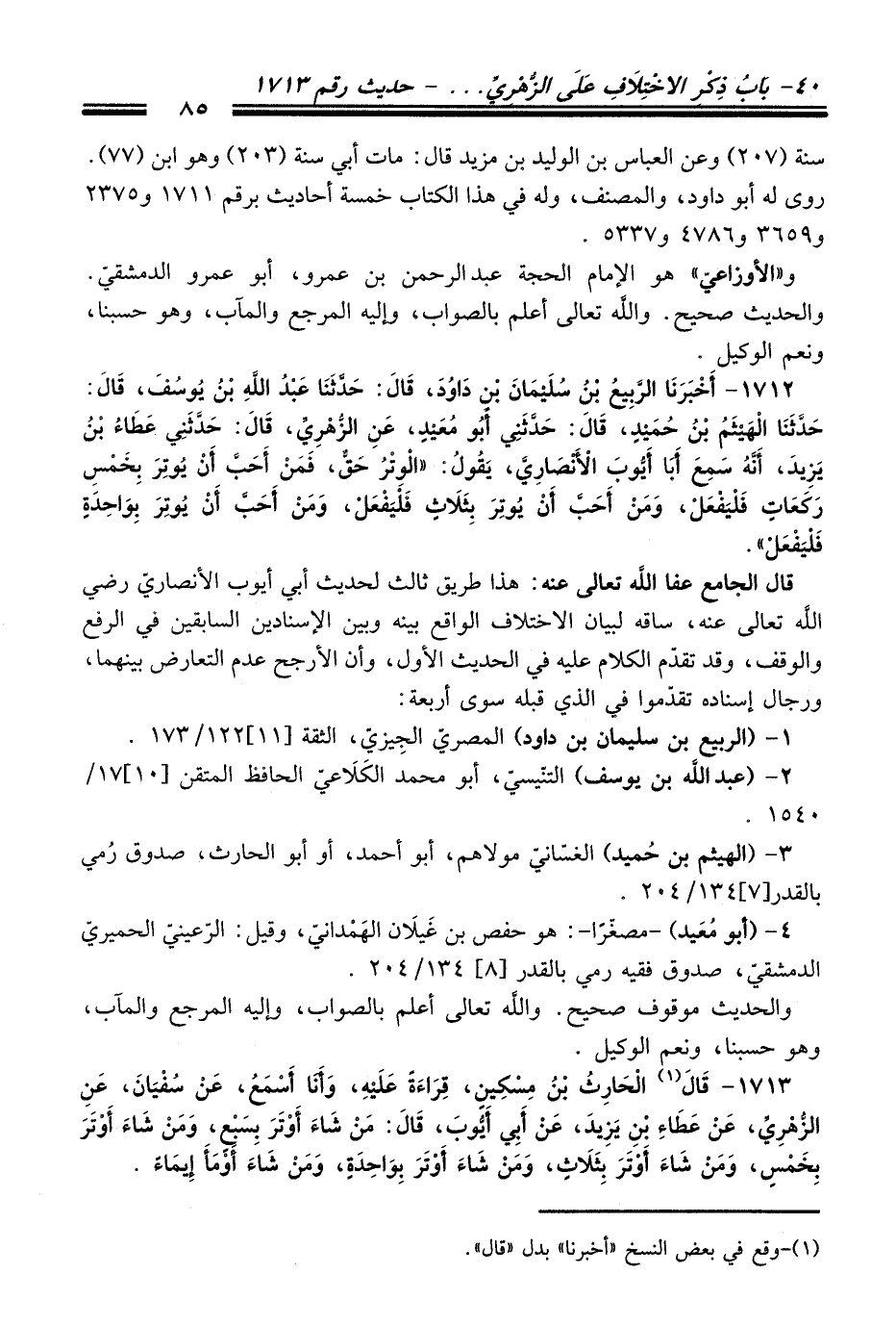 1713 - قَالَ (¬1) الْحَارِثُ بْنُ مِسْكِينٍ, قِرَاءَةً عَلَيْهِ, وَأَنَا أَسْمَعُ, عَنْ سُفْيَانَ, عَنِ الزُّهْرِيِّ, عَنْ عَطَاءِ بْنِ يَزِيدَ, عَنْ أَبِي أَيُّوبَ, قَالَ: مَنْ شَاءَ أَوْتَرَ بِسَبْعٍ, وَمَنْ شَاءَ أَوْتَرَ بِخَمْسٍ, وَمَنْ شَاءَ أَوْتَرَ بِثَلاَثٍ, وَمَنْ شَاءَ أَوْتَرَ بِوَاحِدَةٍ, وَمَنْ شَاءَ أَوْمَأَ إِيمَاءً.