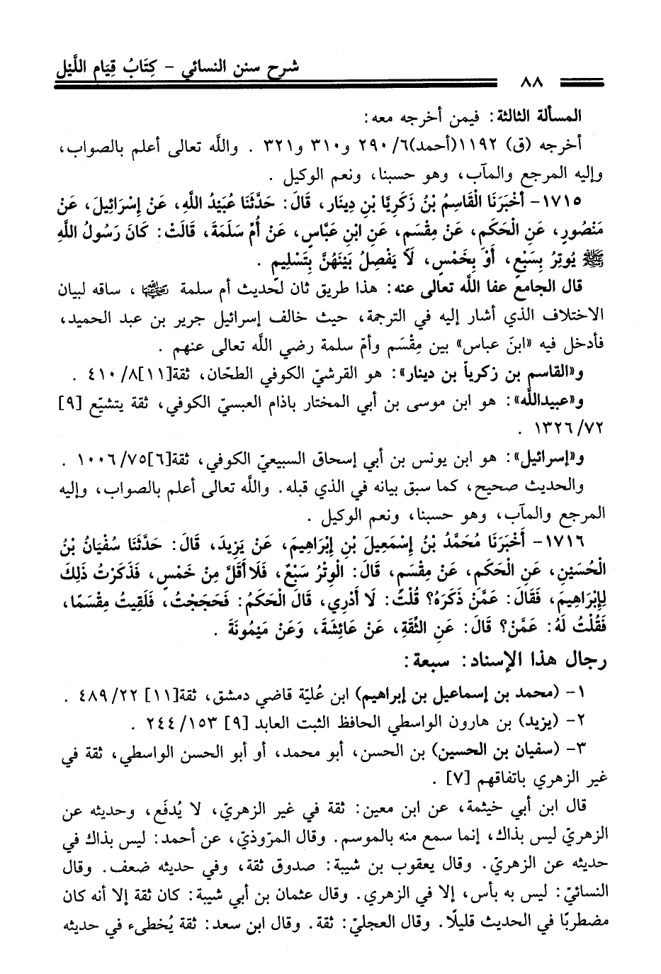 1715 - أَخْبَرَنَا الْقَاسِمُ بْنُ زَكَرِيَّا بْنِ دِينَارٍ, قَالَ: حَدَّثَنَا عُبَيْدُ اللَّهِ, عَنْ إِسْرَائِيلَ, عَنْ مَنْصُورٍ, عَنِ الْحَكَمِ عَنْ مِقْسَمٍ, عَنِ ابْنِ عَبَّاسٍ, عَنْ أُمِّ سَلَمَةَ, قَالَتْ: كَانَ رَسُولُ اللَّهِ - صلى اللَّه عليه وسلم - يُوتِرُ بِسَبْعٍ, أَوْ بِخَمْسٍ, وَلاَ يَفْصِلُ بَيْنَهُنَّ بِتَسْلِيمٍ.