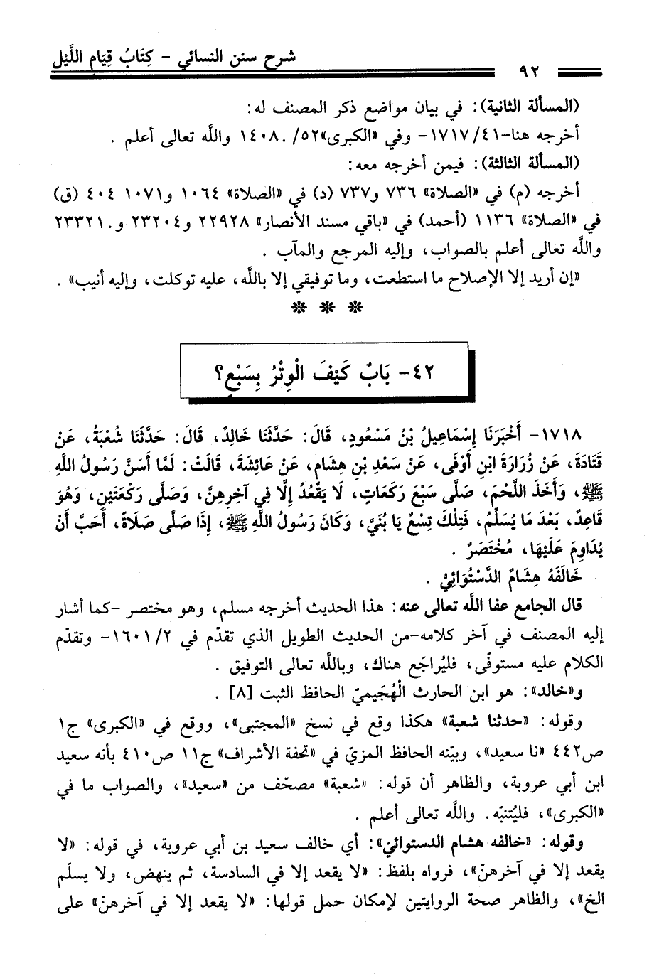 1718 - أَخْبَرَنَا إِسْمَاعِيلُ بْنُ مَسْعُودٍ, قَالَ: حَدَّثَنَا خَالِدٌ, قَالَ: حَدَّثَنَا شُعْبَةُ, عَنْ قَتَادَةَ, عَنْ زُرَارَةَ بْنِ أَوْفَى, عَنْ سَعْدِ بْنِ هِشَامٍ, عَنْ عَائِشَةَ, قَالَتْ: لَمَّا أَسَنَّ رَسُولُ اللَّهِ - صلى اللَّه عليه وسلم -, وَأَخَذَ اللَّحْمَ, صَلَّى سَبْعَ رَكَعَاتٍ, لاَ يَقْعُدُ إِلاَّ فِي آخِرِهِنَّ, وَصَلَّى رَكْعَتَيْنِ, وَهُوَ قَاعِدٌ بَعْدَ مَا يُسَلِّمُ, فَتِلْكَ تِسْعٌ يَا بُنَيَّ, وَكَانَ رَسُولُ اللَّهِ - صلى اللَّه عليه وسلم -, إِذَا صَلَّى صَلاَةً, أَحَبَّ أَنْ يُدَاوِمَ عَلَيْهَا, مُخْتَصَرٌ.