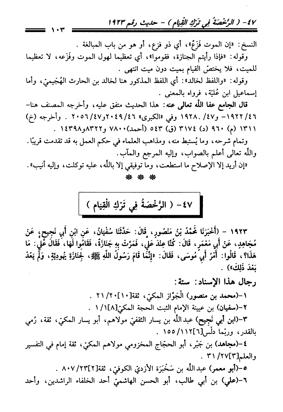 1923 - (أَخْبَرَنَا مُحَمَّدُ بْنُ مَنْصُورٍ, قَالَ: حَدَّثَنَا سُفْيَانُ, عَنِ ابْنِ أَبِي نَجِيحٍ, عَنْ مُجَاهِدٍ, عَنْ أَبِي مَعْمَرٍ, قَالَ: كُنَّا عِنْدَ عَلِيٍّ, فَمَرَّتْ جَنَازَةٌ, فَقَامُوا لَهَا, فَقَالَ عَلِيٌّ: مَا هَذَا؟ , قَالُوا: أَمْرُ أَبِي مُوسَى, فَقَالَ: "إِنَّمَا قَامَ رَسُولُ اللَّهِ - صلى اللَّه عليه وسلم -, لِجَنَازَةِ يَهُودِيَّةٍ, وَلَمْ يَعُدْ بَعْدَ ذَلِكَ").