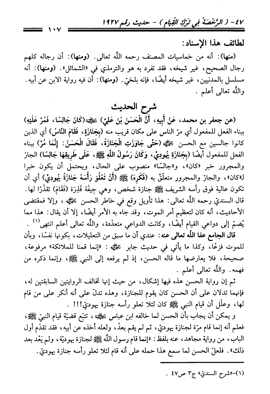 ثم إن رواية الحسن هذه فيها إشكال، من حيث إنها تخالف الروايتين السابقتين له، فإنهما تدلان على أن الحسن كان يقوم للجنازة، وهذه تدلّ على أنه أنكر على من قام لها، وعلّل أن قيام النبي - صلى اللَّه عليه وسلم - كان لئلا تعلو رأسه جنازة يهوديّ!!!.