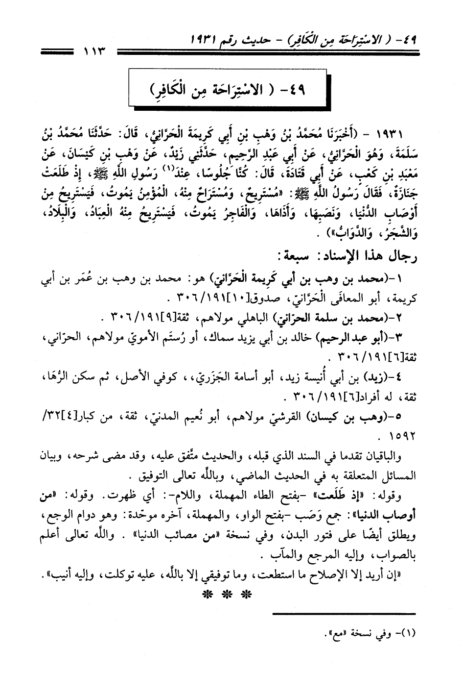 1931 - (أَخْبَرَنَا مُحَمَّدُ بْنُ وَهْبِ بْنِ أَبِي كَرِيمَةَ الْحَرَّانِيُّ, حَدَّثَنَا مُحَمَّدُ بْنُ سَلَمَةَ, وَهُوَ الْحَرَّانِيُّ, عَنْ أَبِي عَبْدِ الرَّحِيمِ, حَدَّثَنِي زَيْدٌ, عَنْ وَهْبِ بْنِ كَيْسَانَ, عَنْ مَعْبَدِ بْنِ كَعْبٍ, عَنْ أَبِي قَتَادَةَ, قَالَ: كُنَّا جُلُوسًا, عِنْدَ (¬1) رَسُولِ اللَّهِ - صلى اللَّه عليه وسلم -, إِذْ طَلَعَتْ جَنَازَةٌ, فَقَالَ رَسُولُ اللَّهِ - صلى اللَّه عليه وسلم -: «مُسْتَرِيحٌ, وَمُسْتَرَاحٌ مِنْهُ, الْمُؤْمِنُ يَمُوتُ, فَيَسْتَرِيحُ مِنْ أَوْصَابِ الدُّنْيَا, وَنَصَبِهَا, وَأَذَاهَا, وَالْفَاجِرُ يَمُوتُ, فَيَسْتَرِيحُ مِنْهُ الْعِبَادُ, وَالْبِلاَدُ, وَالشَّجَرُ, وَالدَّوَابُّ»).
