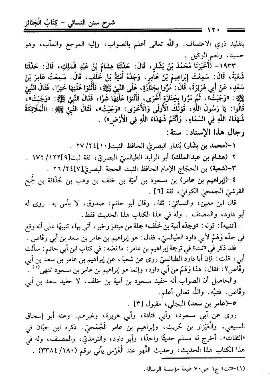 1933 - (أَخْبَرَنَا مُحَمَّدُ بْنُ بَشَّارٍ, قَالَ: حَدَّثَنَا هِشَامُ بْنُ عَبْدِ الْمَلِكِ, قَالَ: حَدَّثَنَا شُعْبَةُ, قَالَ: سَمِعْتُ إِبْرَاهِيمَ بْنَ عَامِرٍ, وَجَدُّهُ أُمَيَّةُ بْنُ خَلَفٍ, قَالَ: سَمِعْتُ عَامِرَ بْنَ سَعْدٍ, عَنْ أَبِي هُرَيْرَةَ, قَالَ: مَرُّوا بِجَنَازَةٍ, عَلَى النَّبِيِّ - صلى اللَّه عليه وسلم -, فَأَثْنَوْا عَلَيْهَا خَيْرًا, فَقَالَ النَّبِيُّ - صلى اللَّه عليه وسلم -: «وَجَبَتْ». ثُمَّ مَرُّوا بِجَنَازَةٍ أُخْرَى, فَأَثْنَوْا عَلَيْهَا شَرًّا, فَقَالَ النَّبِيُّ - صلى اللَّه عليه وسلم -: «وَجَبَتْ» , قَالُوا: يَا رَسُولَ اللَّهِ, قَوْلُكَ الأُولَى وَالأُخْرَى: «وَجَبَتْ» , فَقَالَ النَّبِيُّ - صلى اللَّه عليه وسلم -: «الْمَلاَئِكَةُ شُهَدَاءُ اللَّهِ فِي السَّمَاءِ, وَأَنْتُمْ شُهَدَاءُ اللَّهِ فِي الأَرْضِ»).