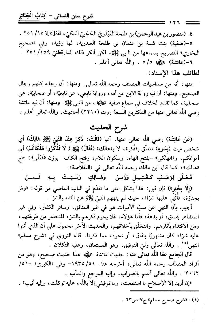 منها: أنه من سداسيات المصنف -رَحِمَهُ اللَّهُ تَعَالَى-. ومنها: أن رجاله كلهم رجال الصحيح. ومنها: أن فيه رواية الابن عن أمه، ورواية تابعي، عن تابعيّة، أو صحابيّة، عن صحابية، كما تقدم الخلاف في سماع صفية - رضي اللَّه عنها -، من النبي - صلى اللَّه عليه وسلم -. ومنها: أن فيه عائشة - رضي اللَّه تعالى عنها - من المكثرين السبعة روت (2210) أحاديث. واللَّه تعالى أعلم.