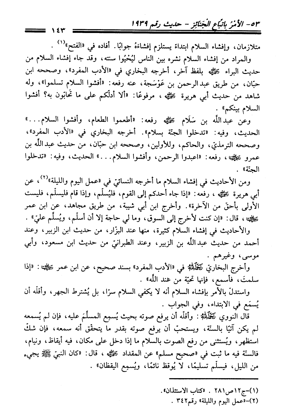 وعن عبد اللَّه بن سَلَام - رضي اللَّه عنه - رفعه: "أطعموا العام، وأفشوا السلام ... " الحديث، وفيه: "تدخلوا الجنّة بسلام". أخرجه البخاريّ في "الأدب المفرد"، وصححه الترمذيّ، والحاكم، وللأودين، وصححه ابن حبّان، من حديث عبد اللَّه بن عمرو - رضي اللَّه عنه -، رفعه: "اعبدوا الرحمن، وأفشوا السلام ... " الحديث، وفيه: "تدخلوا الجنّة".