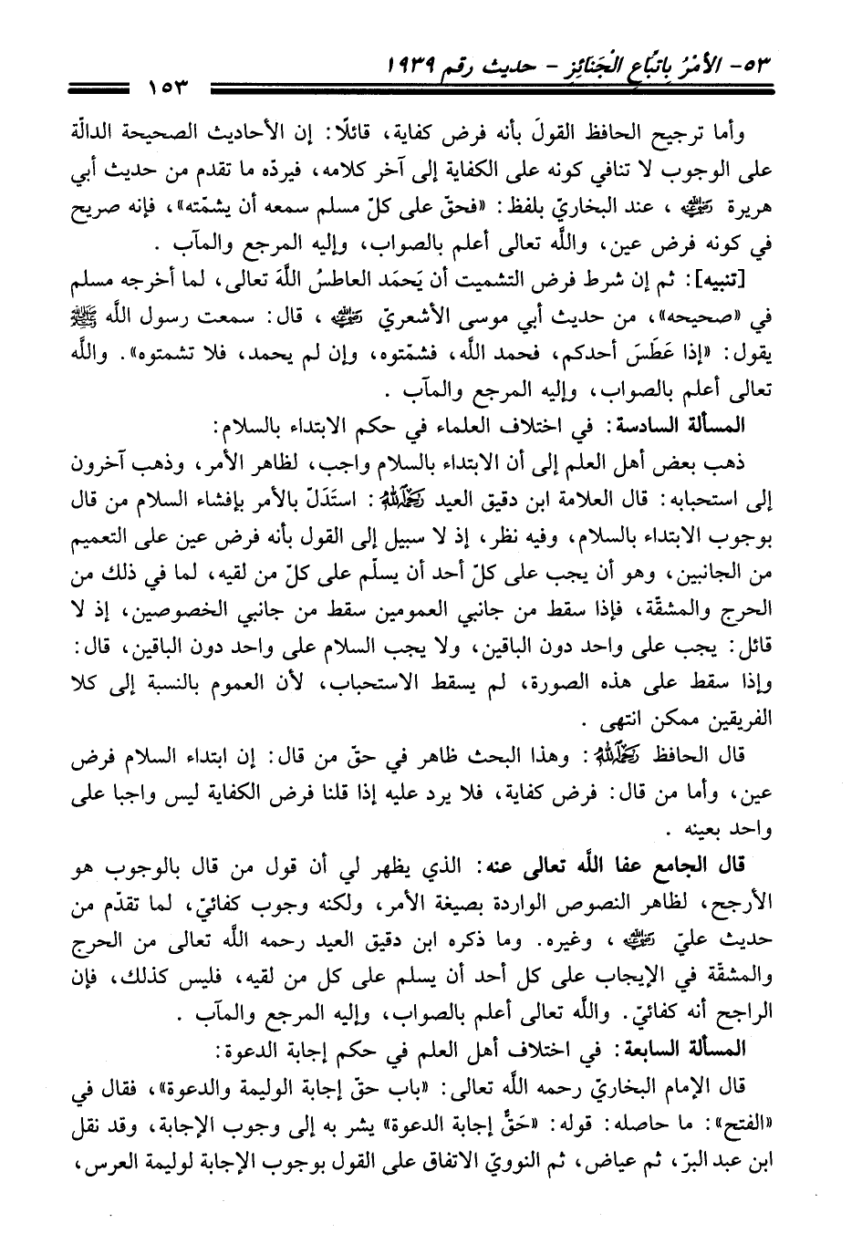 قال الجامع - عفا اللَّه تعالى عنه -: الذي يظهر لي أن قول من قال بالوجوب هو الأرجح، لظاهر النصوص الواردة بصيغة الأمر، ولكنه وجوب كفائيّ، لما تقدّم من حديث عليّ - رضي اللَّه عنه -، وغيره. وما ذكره ابن دقيق العيد -رَحِمَهُ اللَّهُ تَعَالَى- من الحرج والمشقّة في الإيجاب على كل أحد أن يسلم على كل من لقيه، فليس كذلك، فإن الراجح أنه كفائيّ. واللَّه تعالى أعلم بالصواب، وإليه المرجع والمآب.