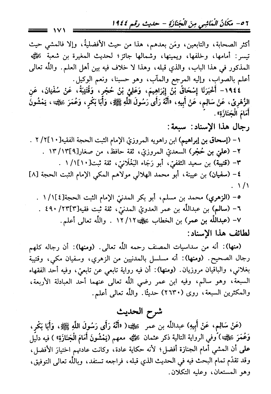 1944 - أَخْبَرَنَا إِسْحَاقُ بْنُ إِبْرَاهِيمَ, وَعَلِيُّ بْنُ حُجْرٍ, وَقُتَيْبَةُ, عَنْ سُفْيَانَ, عَنِ الزُّهْرِيِّ, عَنْ سَالِمٍ عَنْ أَبِيهِ, "أَنَّهُ رَأَى رَسُولَ اللَّهِ - صلى اللَّه عليه وسلم -, وَأَبَا بَكْرٍ, وَعُمَرَ - رَضِيَ اللَّهُ عَنْهُمَا -, يَمْشُونَ أَمَامَ الْجَنَازَةِ".