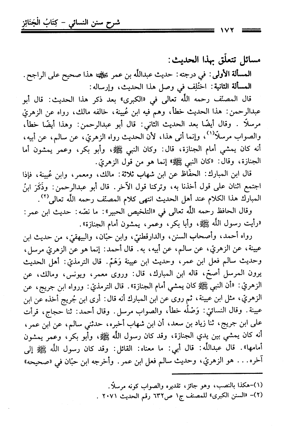 قال المصنّف -رَحِمَهُ اللَّهُ تَعَالَى- في "الكبرى" بعد ذكر هذا الحديث: قال أبو عبدالرحمن: هذا الحديث خطأ، وهم فيه ابن عُيينة، خالفه مالك، رواه عن الزهريّ مرسلاً. وقال أيضًا بعد الحديث الثاني: قال أبو عبدالرحمن: وهذا أيضًا خطأ، والصواب مرسلاً (¬1)، وإنما أتى هذا، لأن الحديث رواه الزهريّ، عن سالم، عن أبيه، أنه كان يمشي أمام الجنازة، قال: وكان النبي - صلى اللَّه عليه وسلم -، وأبو بكر، وعمر يمشون أما الجنازة، وقال: "كان النبي - صلى اللَّه عليه وسلم -" إنما هو من قول الزهريّ.