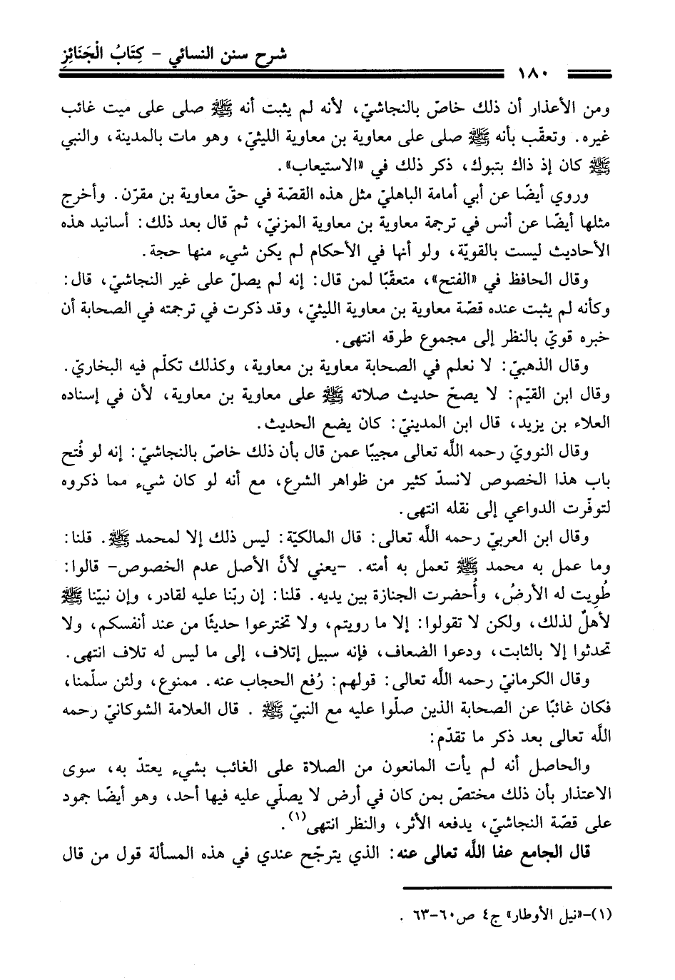 والحاصل أنه لم يأت المانعون من الصلاة على الغائب بشيء يعتدّ به، سوى الاعتذار بأن ذلك مختصّ بمن كان في أرض لا يصلّي عليه فيها أحد، وهو أيضًا جمود على قصّة النجاشيّ، يدفعه الأثر، والنظر انتهى (¬1).