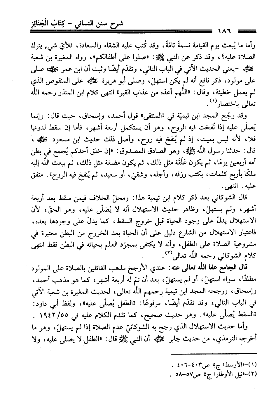 قال الشوكاني بعد ذكر كلام ابن تيمية هذا: ومحلّ الخلاف فيمن سقط بعد أربعة أشهر، ولم يستهلّ، وظاهر حديث الاستهلال أنه لا يُصَلّى عليه، وهو الحقّ، لأن الاستهلال يدلّ على وجود الحياة قبل خروج السقط، كما يدلّ على وجودها بعده، فاعتبار الاستهلال من الشارع دليل على أن الحياة بعد الخروج من البطن معتبرة في مشروعية الصلاة على الطفل، وأنه لا يكتفى بمجرّد العلم بحياته في البطن فقط انتهى كلام الشوكاني -رَحِمَهُ اللَّهُ تَعَالَى- (¬2).