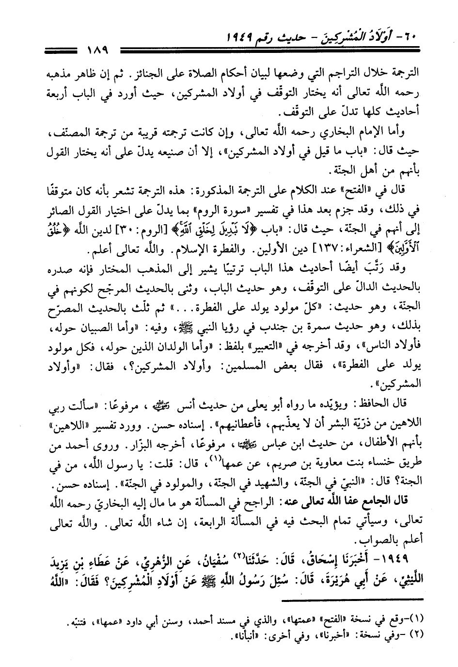 1949 - أَخْبَرَنَا إِسْحَاقُ, قَالَ: حَدَّثَنَا (¬2) سُفْيَانُ, عَنِ الزُّهْرِيِّ, عَنْ عَطَاءِ بْنِ يَزِيدَ اللَّيْثِيِّ, عَنْ أَبِي هُرَيْرَةَ, قَالَ: سُئِلَ رَسُولُ اللَّهِ - صلى اللَّه عليه وسلم - عَنْ أَوْلاَدِ الْمُشْرِكِينَ؟ فَقَالَ: «اللَّهُ