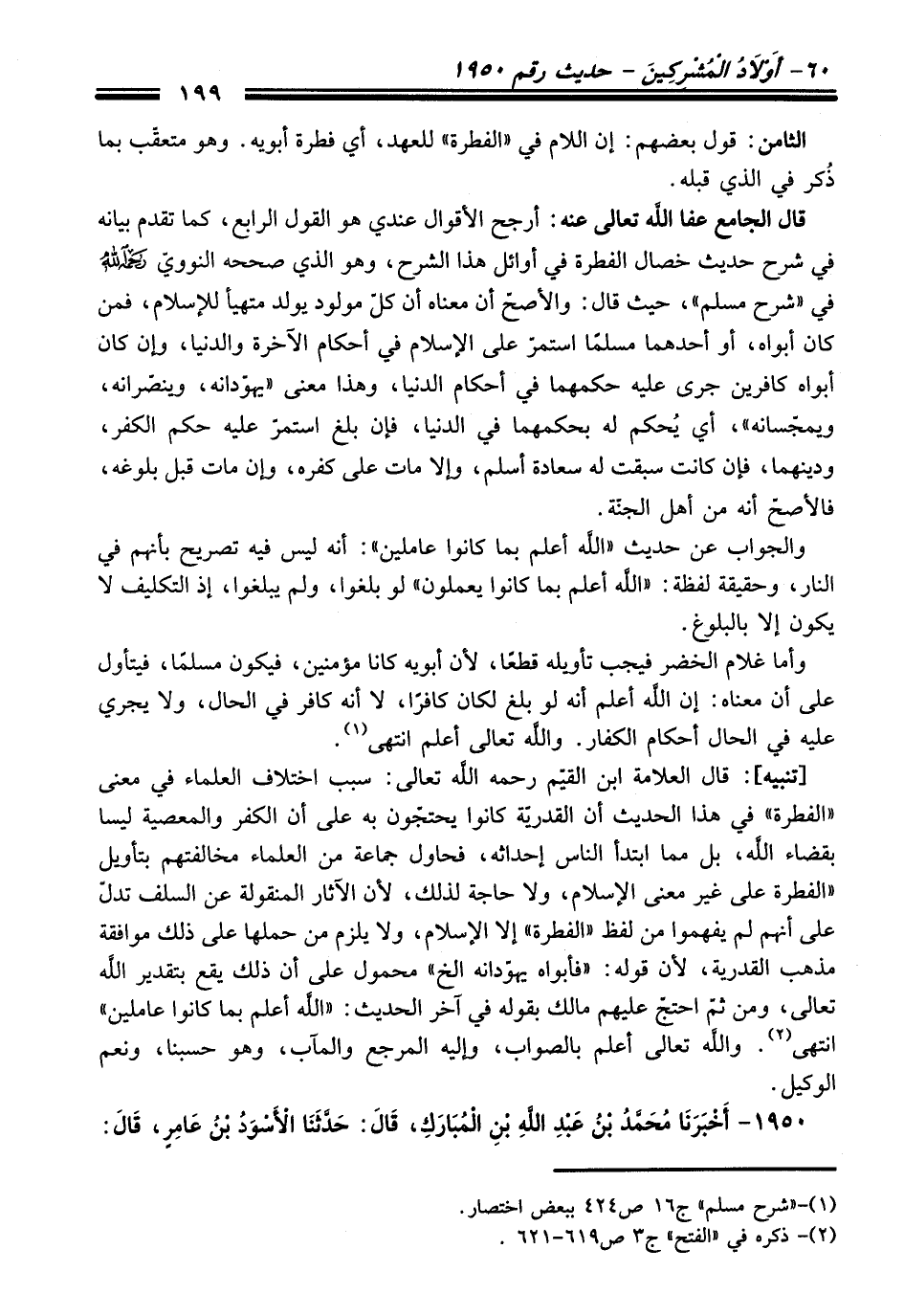 [تنبيه]: قال العلامة ابن القيّم -رَحِمَهُ اللَّهُ تَعَالَى-: سبب اختلاف العلماء في معنى "الفطرة" في هذا الحديث أن القدريّة كانوا يحتجّون به على أن الكفر والمعصية ليسا بقضاء اللَّه، بل مما ابتدأ الناس إحداثه، فحاول جماعة من العلماء مخالفتهم بتأويل "الفطرة على غير معنى الإسلام، ولا حاجة لذلك، لأن الآثار المنقولة عن السلف تدلّ على أنهم لم يفهموا من لفظ "الفطرة" إلا الإسلام، ولا يلزم من حملها على ذلك موافقة مذهب القدرية، لأن قوله: "فأبواه يهوّدانه الخ" محمول على أن ذلك يقع بتقدير اللَّه تعالى، ومن ثمّ احتجّ عليهم مالك بقوله في آخر الحديث: "اللَّه أعلم بما كانوا عاملين" انتهى (¬2). واللَّه تعالى أعلم بالصواب، وإليه المرجع والمآب، وهو حسبنا، ونعم الوكيل.
