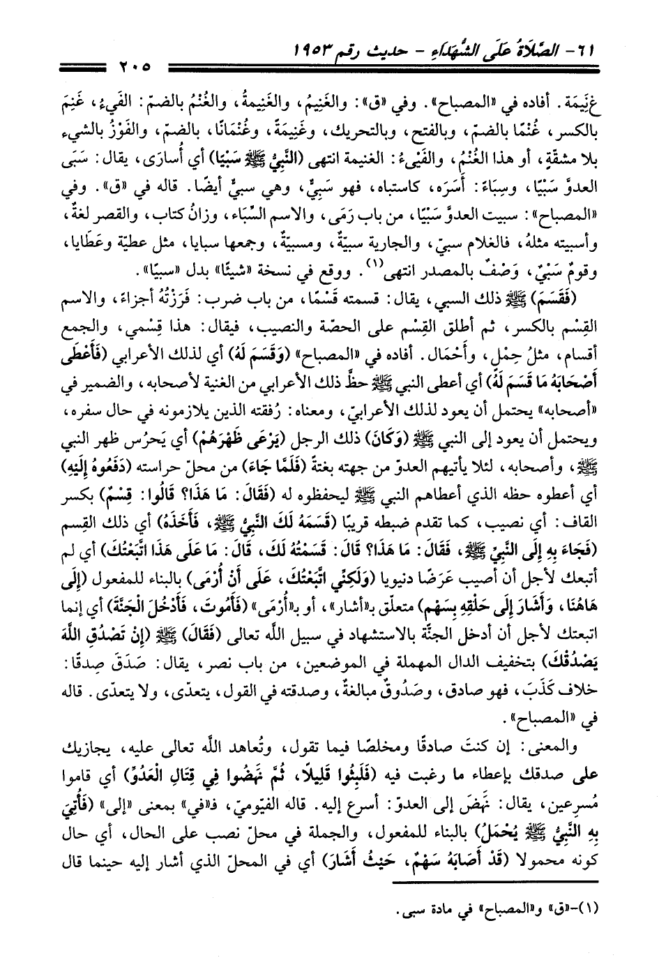 غَنيمَة. أفاده في "المصباح". وفي "ق": والغَنِيمُ، والغَنِيمةُ، والغُنْمُ بالضمّ: الفَيءُ، غَنِمَ بالكسر، غُنْمًا بالضمّ، وبالفتح، وبالتحريك، وغَنِيمَةً، وغُنْمَانًا، بالضمّ، والفَوْزُ بالشيء بلا مشقّةٍ، أو هذا الغُنْمُ، والفَيْىءُ: الغنيمة انتهى (النَّبِيُّ - صلى اللَّه عليه وسلم - سَبْيًا) أي أُسارَى، يقال: سَبَى العدوَّ سَبْيًا، وسِبَاءً: أسَرَه، كاستباه، فهو سَبِيٌّ، وهي سبيٌّ أيضًا. قاله في "ق". وفي "المصباح": سبيت العدوَّ سَبْيًا، من باب رَمَى، والاسم السِّبَاء، وزانُ كتاب، والقصر لغةٌ، وأسبيته مثلهُ، فالغلام سبيّ، والجارية سبيّةٌ، ومسبيّةٌ، وجمعها سبايا، مثل عطيّة وعَطَايا، وقومٌ سَبْيٌ، وَصْفٌ بالمصدر انتهى (¬1). ووقع في نسخة "شيئًا" بدل "سبيًا".