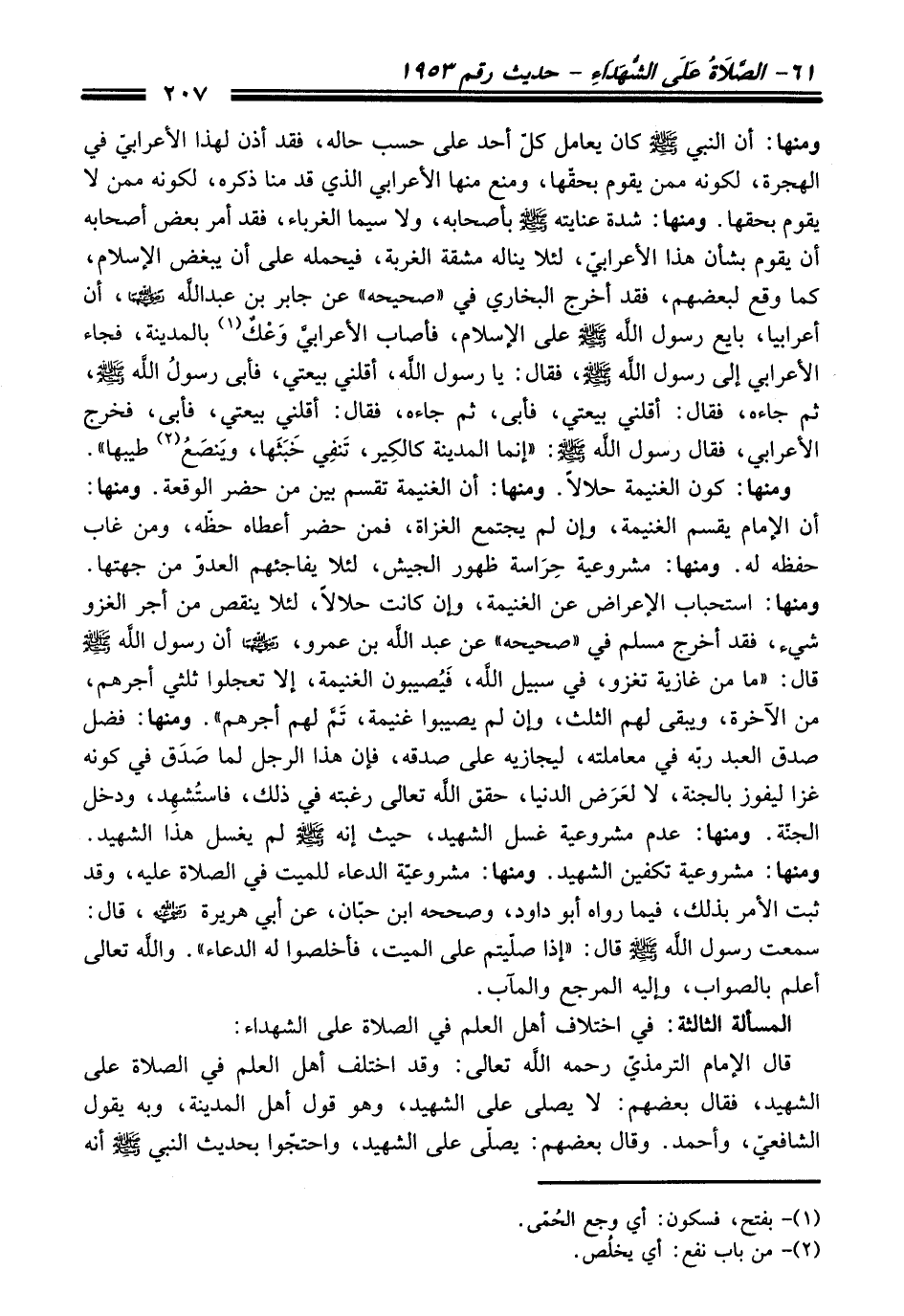 ومنها: كون الغنيمة حلالاً. ومنها: أن الغنيمة تقسم بين من حضر الوقعة. ومنها: أن الإمام يقسم الغنيمة، لمان لم يجتمع الغزاة، فمن حضر أعطاه حظّه، ومن غاب حفظه له. ومنها: مشروعية حِرَاسة ظهور الجيش، لئلا يفاجئهم العدوّ من جهتها. ومنها: استحباب الإعراض عن الغنيمة، وإن كانت حلالاً، لئلا ينقص من أجر الغزو شيء، فقد أخرج مسلم في "صحيحه" عن عبد اللَّه بن عمرو، - رضي اللَّه عنهما - أن رسول اللَّه - صلى اللَّه عليه وسلم - قال: "ما من غازية تغزو، في سبيل اللَّه، فَيُصيبون الغنيمة، إلا تعجلوا ثلثي أجرهم، من الآخرة، ويبقى لهم الثلث، وإن لم يصيبوا غنيمة، تَمَّ لهم أجرهم". ومنها: فضل صدق العبد ربّه في معاملته، ليجازيه على صدقه، فإن هذا الرجل لما صَدَق في كونه غزا ليفوز بالجنة، لا لعَرَض الدنيا، حقق اللَّه تعالى رغبته في ذلك، فاستُشهِد، ودخل الجنّة. ومنها: عدم مشروعية غسل الشهيد، حيث إنه - صلى اللَّه عليه وسلم - لم يغسل هذا الشهيد. ومنها: مشروعية تكفين الشهيد. ومنها: مشروعيّة الدعاء للميت في الصلاة عليه، وقد ثبت الأمر بذلك، فيما رواه أبو داود، وصححه ابن حبّان، عن أبي هريرة - رضي اللَّه عنه -، قال: سمعت رسول اللَّه - صلى اللَّه عليه وسلم - قال: "إذا صلّيتم على الميت، فأخلصوا له الدعاء". واللَّه تعالى أعلم بالصواب، وإليه المرجع والمآب.