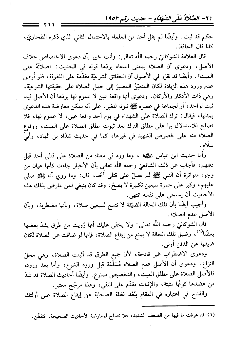 قال العلامة الشوكانيّ -رَحِمَهُ اللَّهُ تَعَالَى-: وأنت خبير بأن دعوى الاختصاص خلاف الأصل، ودعوى أن الصلاة بمعنى الدعاء يردّها قوله في الحديث: "صلاتَهُ على الميت". وأيضًا قد تقرّر في الأصول أن الحقائق الشرعيّة مقدّمة على اللغويّة، فلو فُرض عدم ورود هذه الزيادة لكان المتعيّنُ المصيرَ إلى حمل الصلاة على حقيقتها الشرعيّة، وهي ذات الأذكار والأركان. ودعوى أنها واقعة عين لا عموم لها يردّها أن الأصل فيما ثبت لواحد، أو لجماعة في عصره - صلى اللَّه عليه وسلم - ثبوته للغير. على أنه يمكن معارضة هذه الدعوى بمثلها، فيقال: ترك الصلاة على الشهداء في يوم أحد واقعة عين، لا عموم لها، فلا تصلح للاستدلال بها على مطلق الترك بعد ثبوت مطلق الصلاة على الميت، ووقوعِ الصلاة منه على خصوص الشهيد في غيرها، كما في حديث شدّاد بن الهاد، وأبي سلّام.